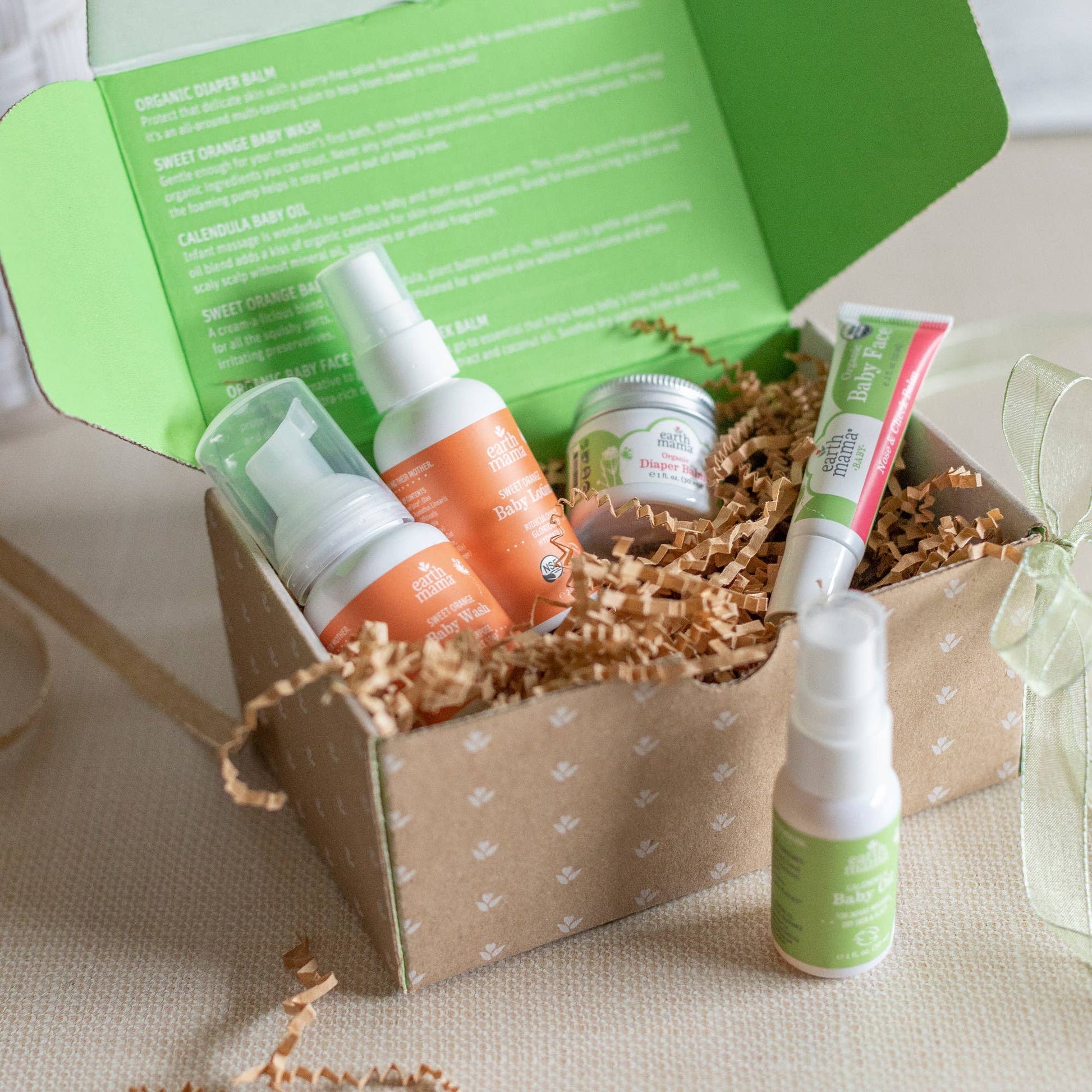 An organic gift of herbal goodness that’s almost as sweet as a brand-new baby. This 5-piece cruelty-free set includes travel sizes of Earth Mama bestsellers: Organic Diaper Balm 1 fl. oz., Sweet Orange Baby Lotion, Sweet Orange Castile Baby Wash 1.67 fl. oz., Calendula Baby Oil 1 fl. oz., Organic Baby Face Nose & Cheek Balm .5 fl. oz., all wrapped up in ready-to-gift eco-packaging made with 100% recycled cardboard.
