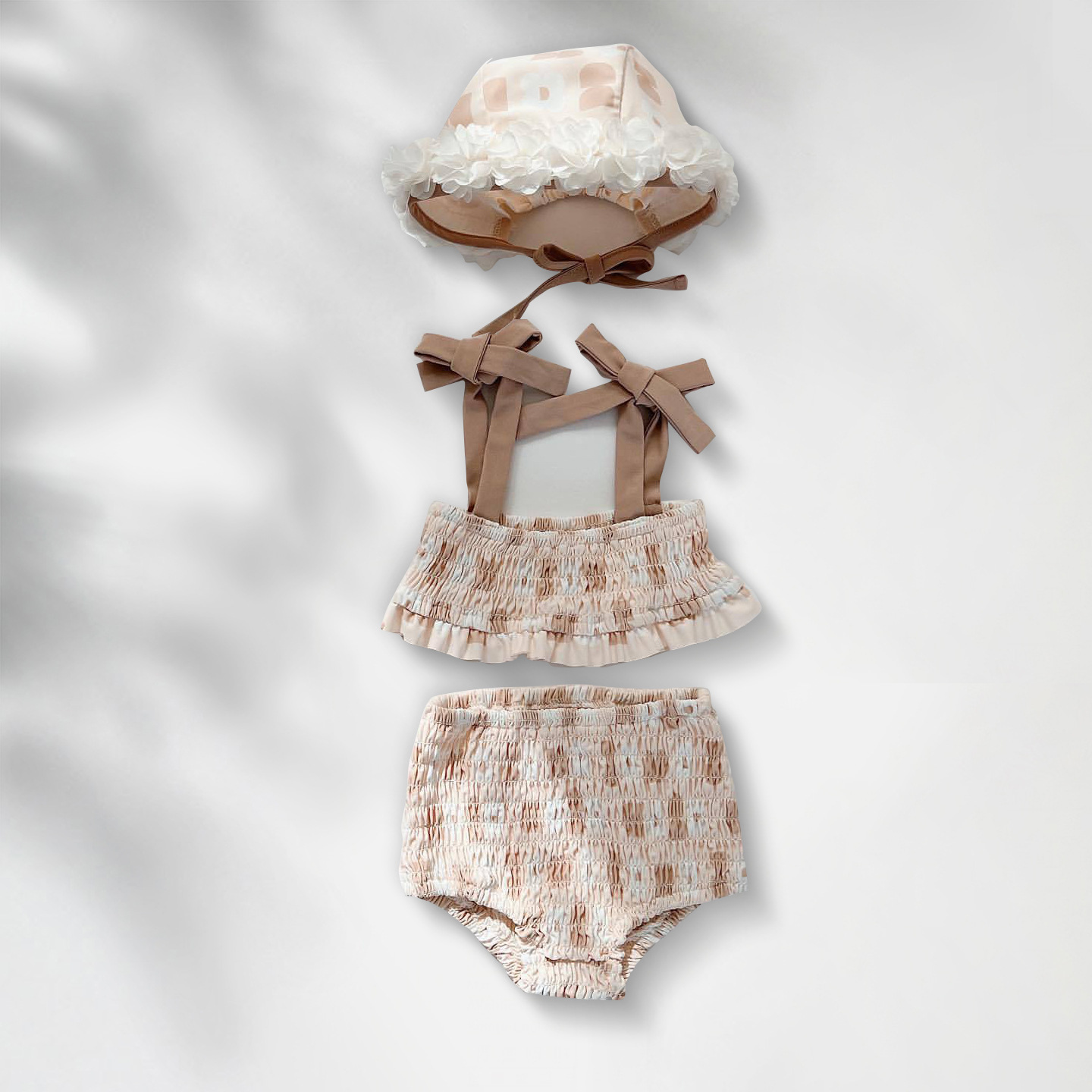 Girls' swimsuit set with hood available as a set of 2 or a set of 3 in various colors.
