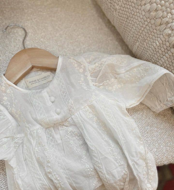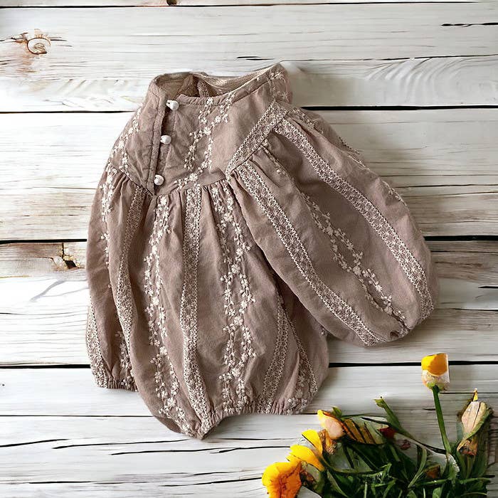 Adorable cotton bodysuit with floral embroidery and mother-of-pearl buttons.