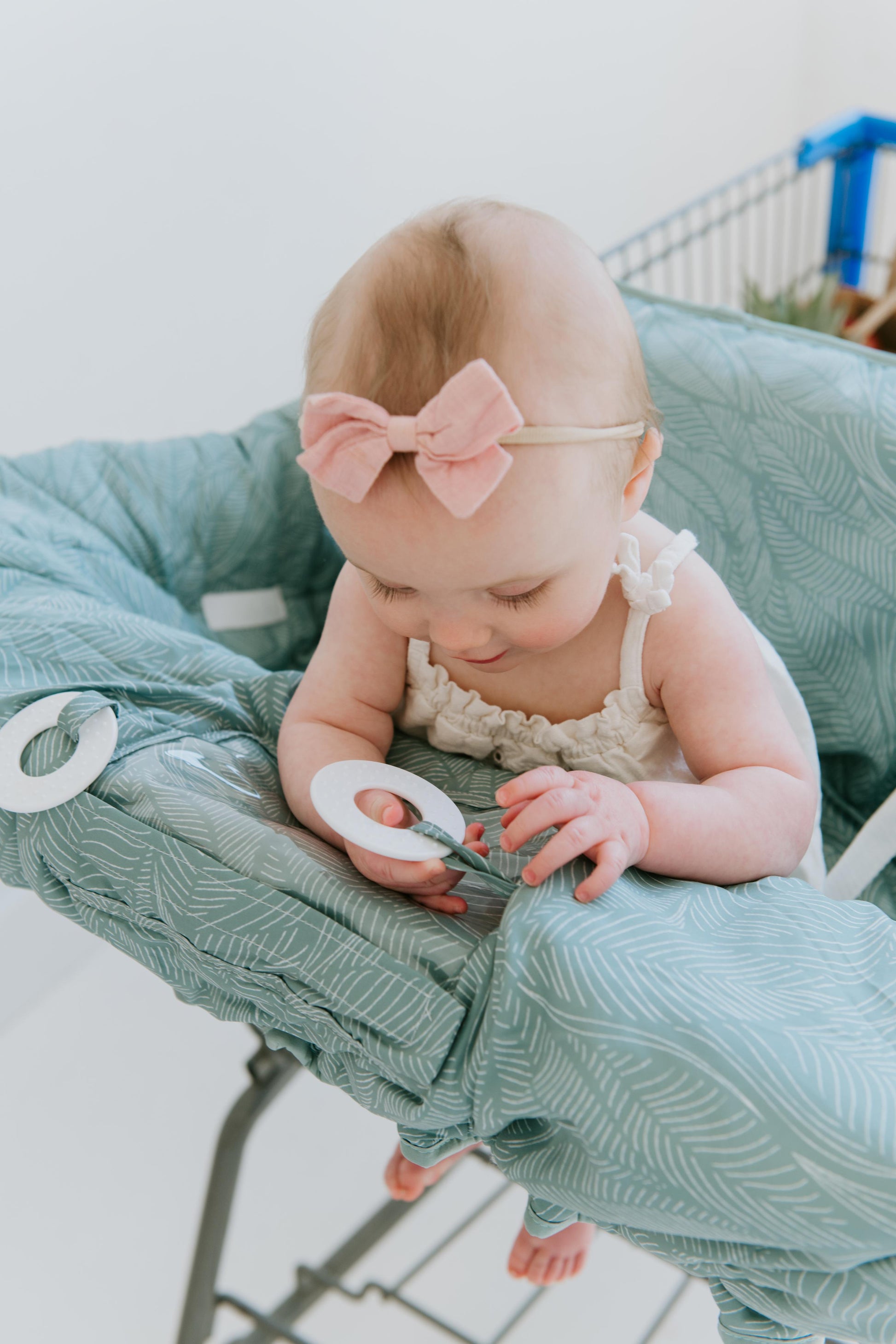 Our Binxy Baby Shopping Cart Cover in velvety soft (and washable) fabric provides just the right amount of cushion and protection for your child. It quickly and easily slips onto most carts, provides a 360 degree germ barrier utilizing our proprietary attachment clips, then simply folds up within itself for easy transportation and storage. The see-through pocket keeps screens secured and clean, while the two attached toy rings provide entertainment for your child while you shop!