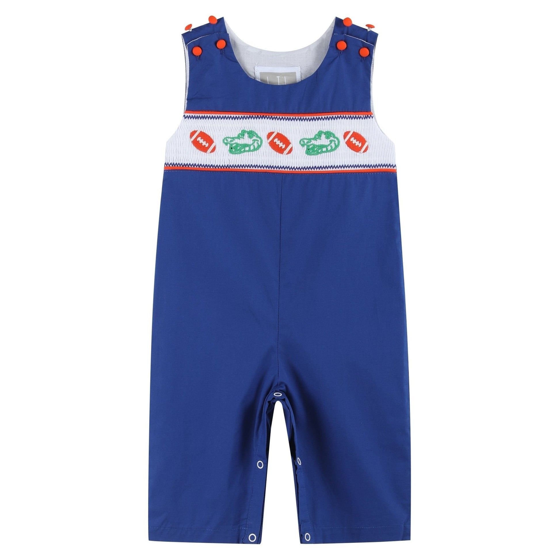 Get ready for a touchdown of cuteness with our Blue and Orange Football Smocked Overalls! Featuring adorable smocking on the chest and playful embroidery of footballs and alligators, this outfit is a winning play for your little quarterback. Kick off the fun with style in these charming football-themed overalls, perfect for your tiny sports enthusiast