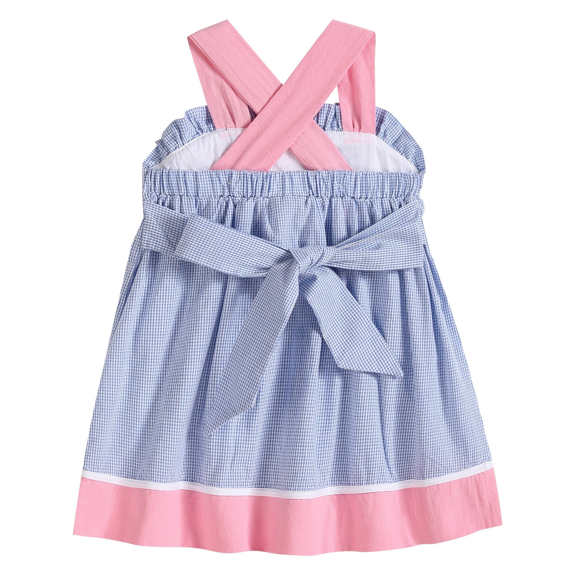 Let your sweet girl show off her style with this dazzling Blue and Pink Ocean Smocked Sundress. This dress features pretty ocean embroidery on a smocking panel, pink crisscross straps, and a tie bow back. Your little beach-goer will be ready to splash around in the waves and catch some rays. Summer's never looked so sweet!