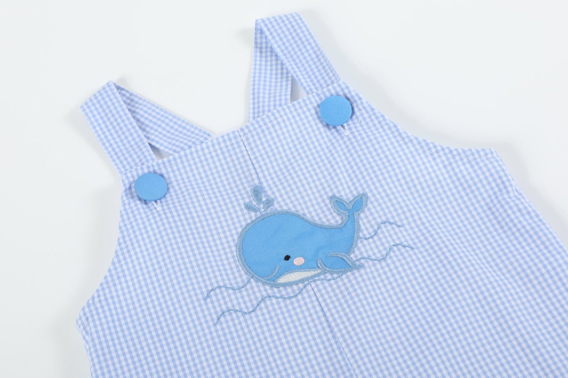 Dress your little sailor in style with our Blue Gingham Whale Overall Shortalls! Featuring an adorable whale applique, cloth-covered buttons for adjustable sizing, and convenient snaps at the crotch for easy diaper changes. Set sail for cute adventures!