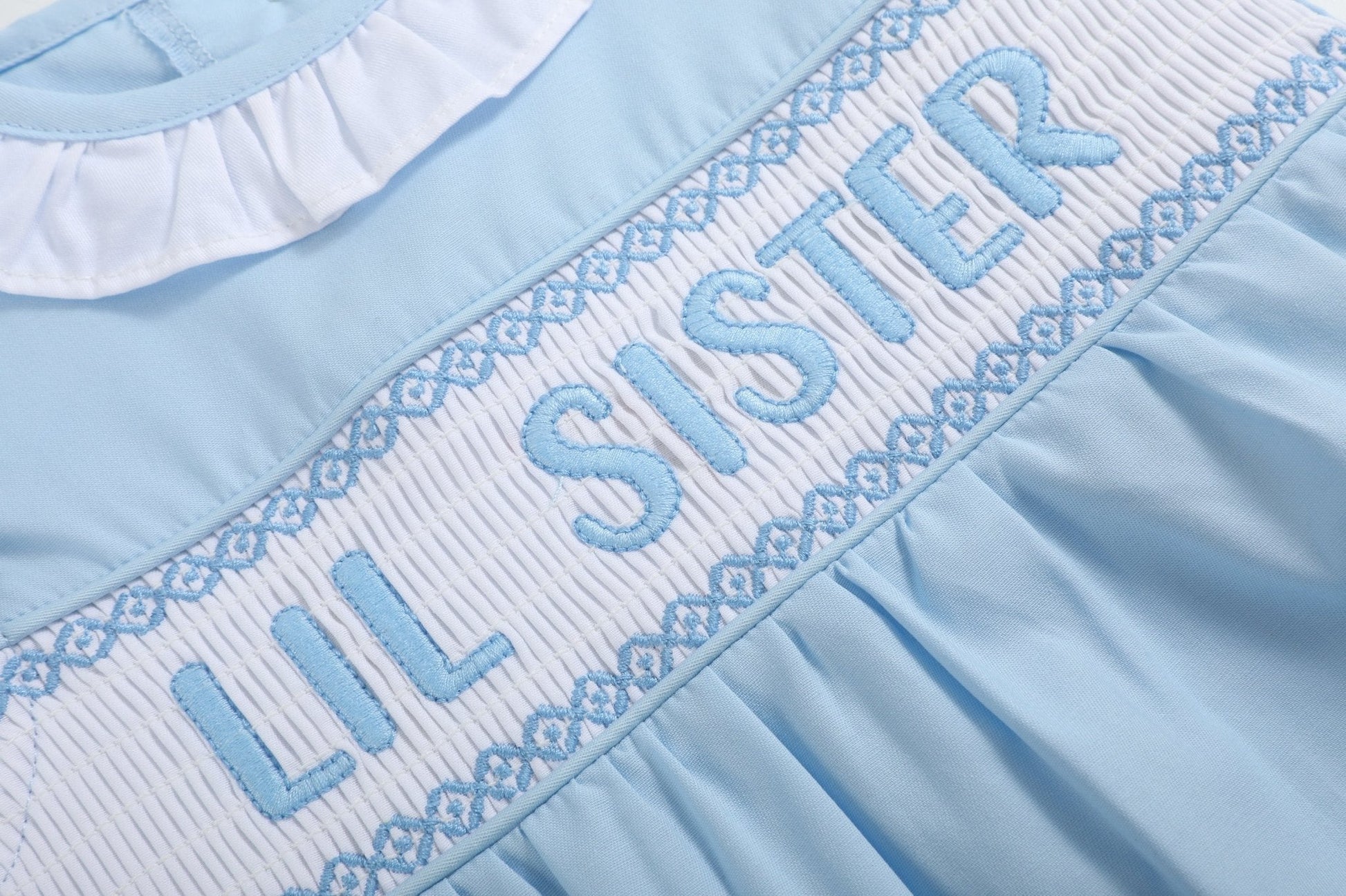 Celebrate your little girl in the sweetest way with this Blue Lil Sister Smocked Romper! Featuring delicate smocking across the chest with "Lil Sister" beautifully embroidered, this romper is perfect for welcoming a new baby or matching with big siblings. Made from soft, breathable fabric in a lovely shade of blue, it offers all-day comfort for your little one. Snaps at the crotch allow for easy diaper changes, and the bubble-style silhouette gives it a classic, playful look.