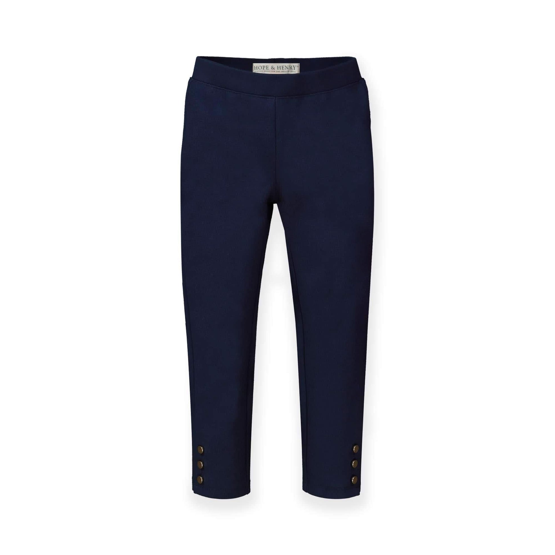 Our ponte button cuff pant is a flattering and easy silhouette that she'll want to wear day in and day out. Our cozy knit is much thicker than the average legging and offers easy pull-on functionality with a flat elastic waistband. Features a slim fit and gold shank buttons at the ankle cuffs for just the right amount of shine.