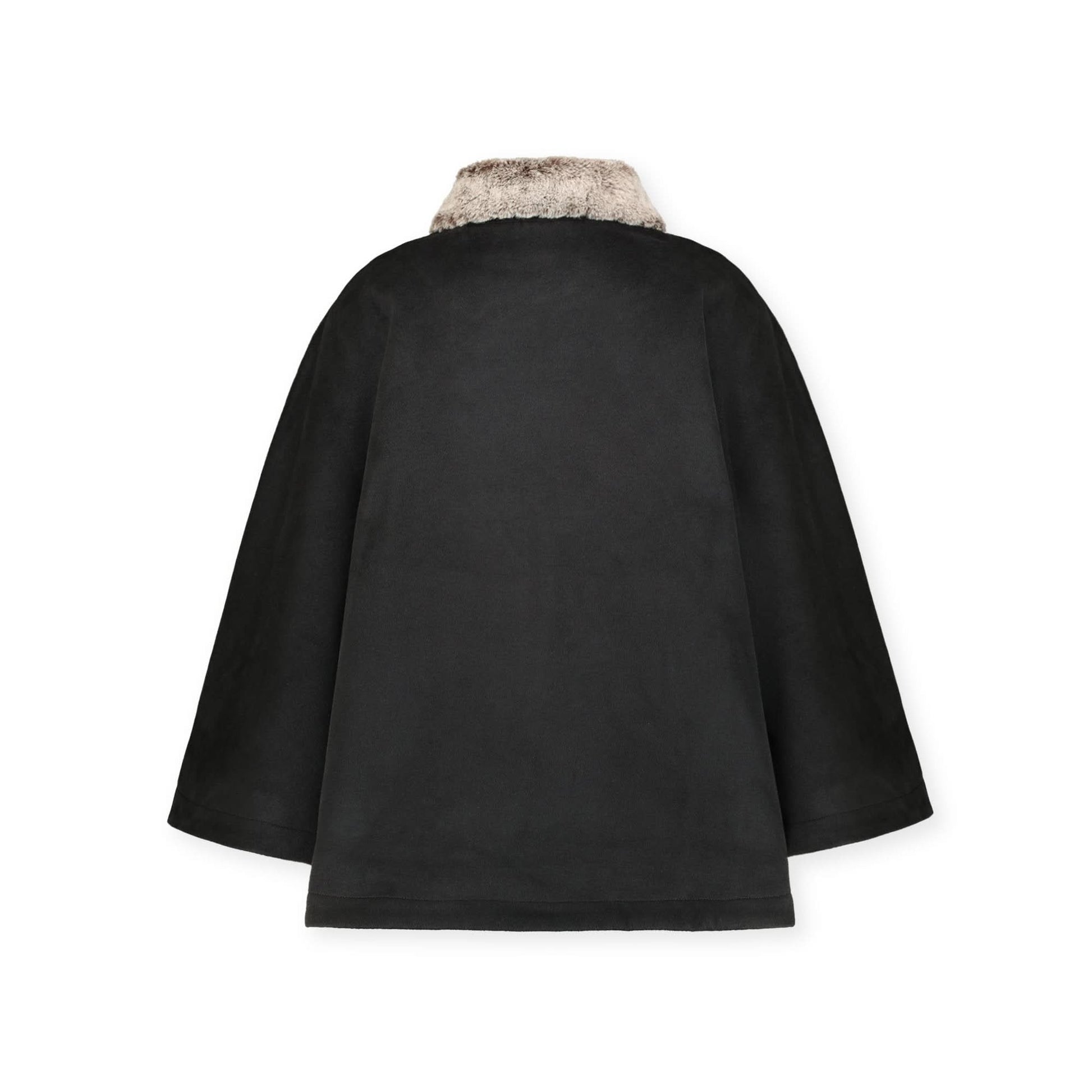 This charming cape is an effortless piece that layers easily over one of our beautiful sweaters or tops. Ours is crafted from a medium weight wool-like fabric that feels so soft against the skin, and features a faux fur collar with faux horn buttons in the most flattering silhouette.
