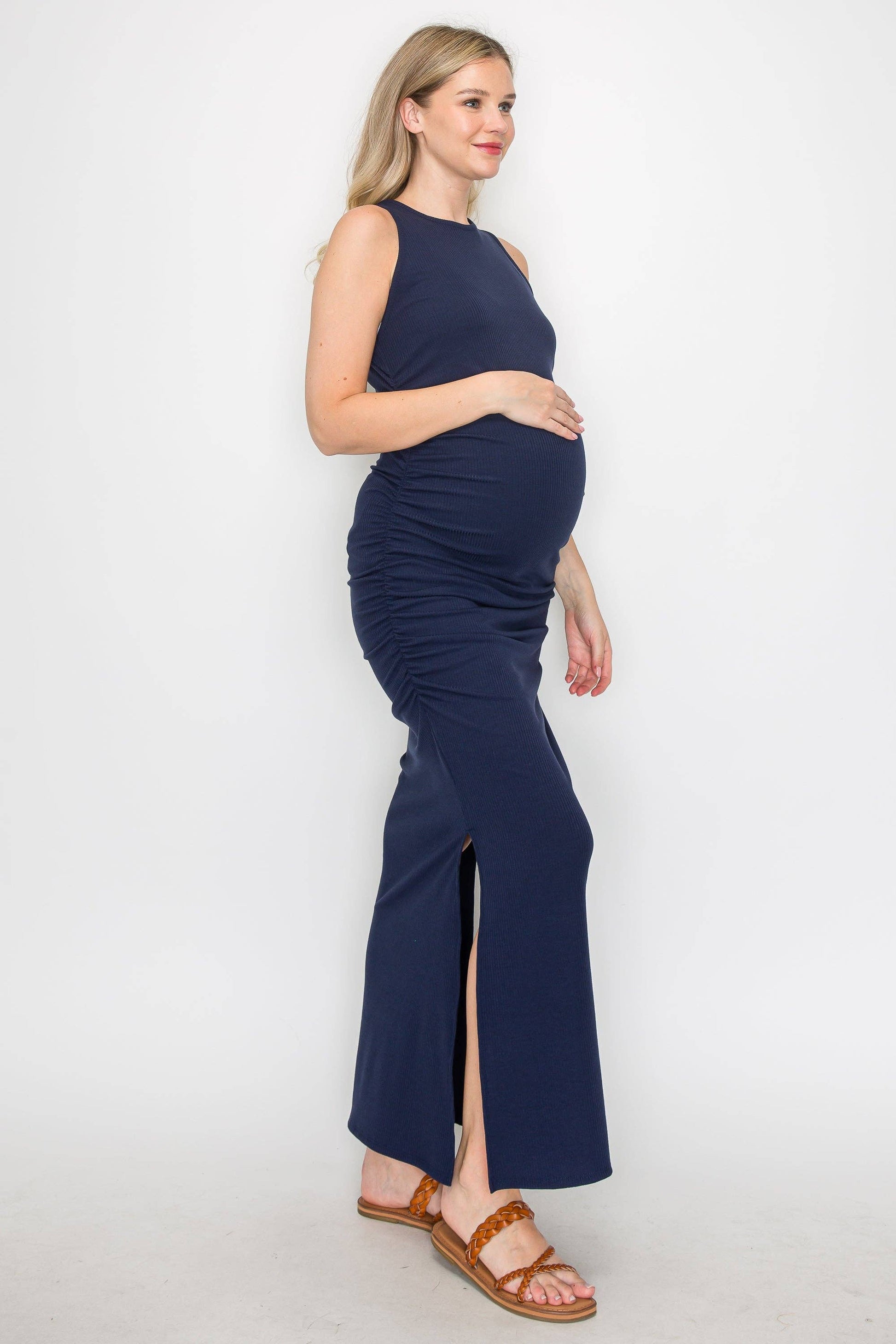 The Celestine Tank Ribbed Long Dress W/Side Slit is constructed of a soft polyester blend that is stretchy, light, and breathable. This tank ribbed long dress is comfortable for any pregnant mama to wear all day long. Featuring a trendy side slit and a form-fitting tank style. Can be easily dressed up or down. You can wear this maternity dress to any occasion such as going to work, attending a baby shower, or a night out with your friends.