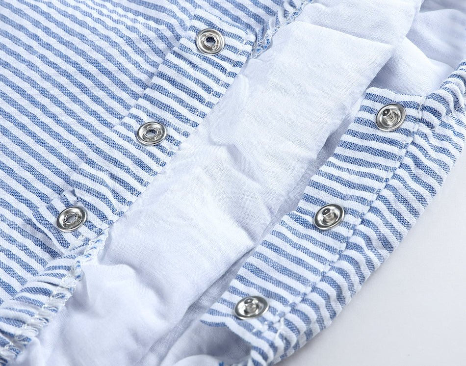 This adorable dark blue seersucker romper is soft, cool and easy to care for. Perfect to wear as is or ready for your embroidery or monogram with its blank front panel. The snaps make it easy for a quick change which is great for you and your cutie.