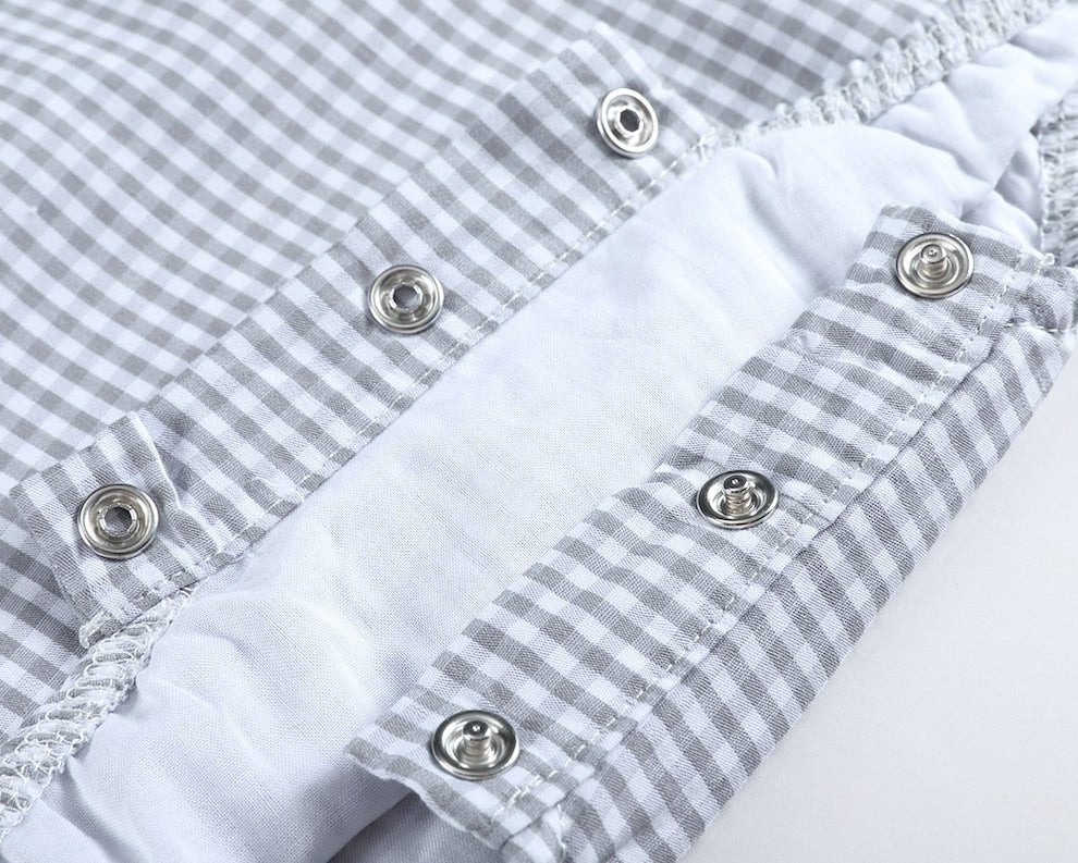 This adorable gray gingham romper is soft, cool and easy to care for. Perfect to wear as is or ready for your embroidery or monogram with its blank front panel. The snaps make it easy for a quick change which is great for you and your cutie.
