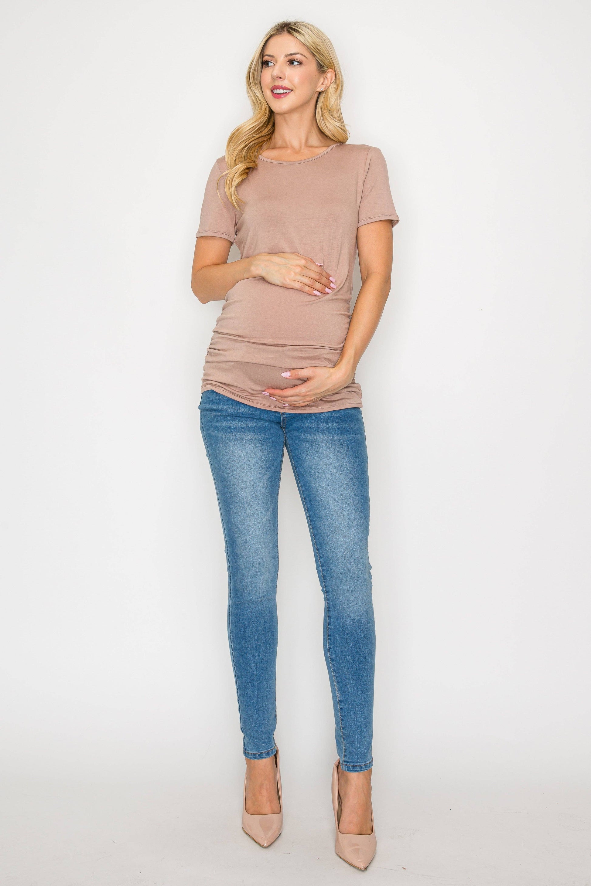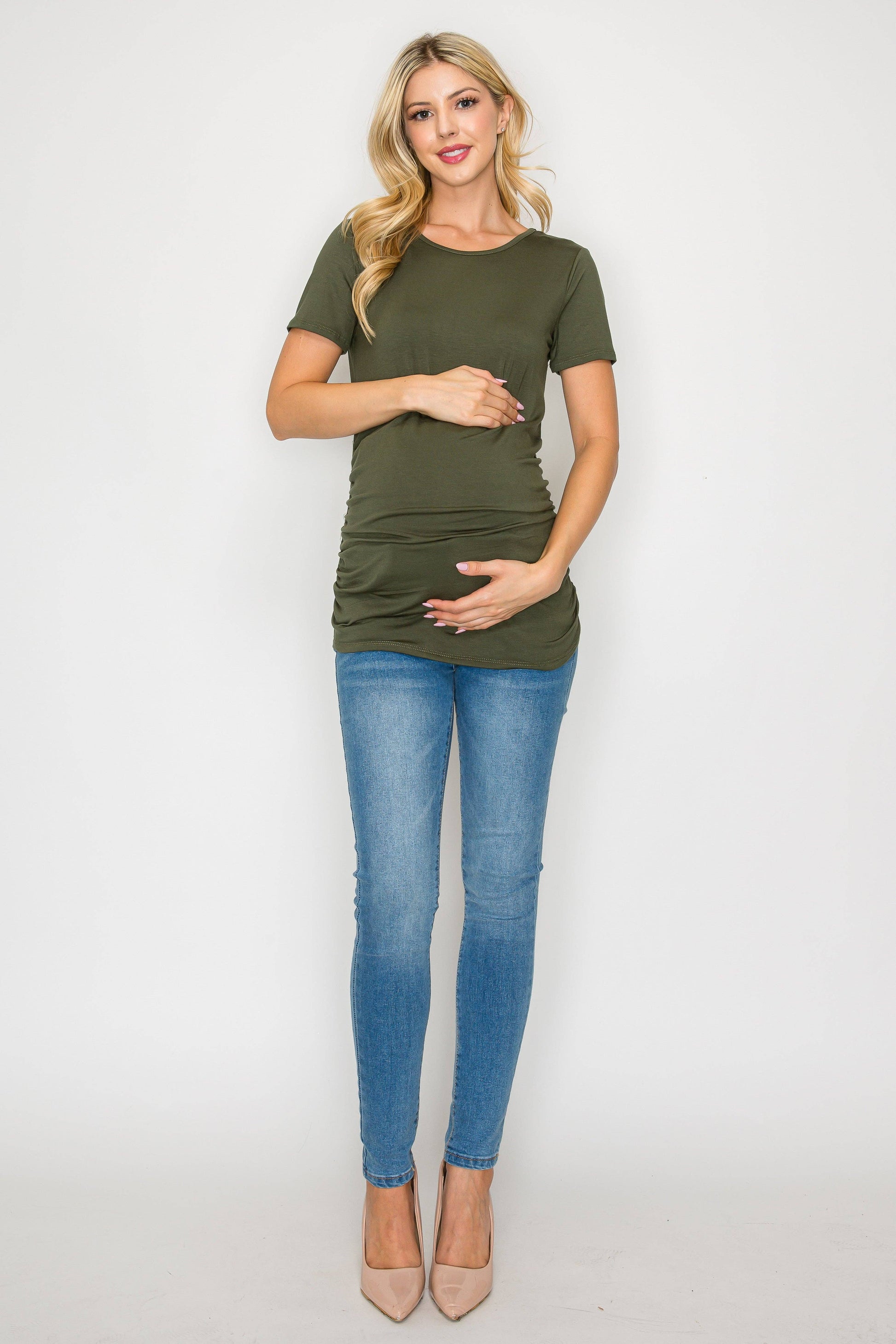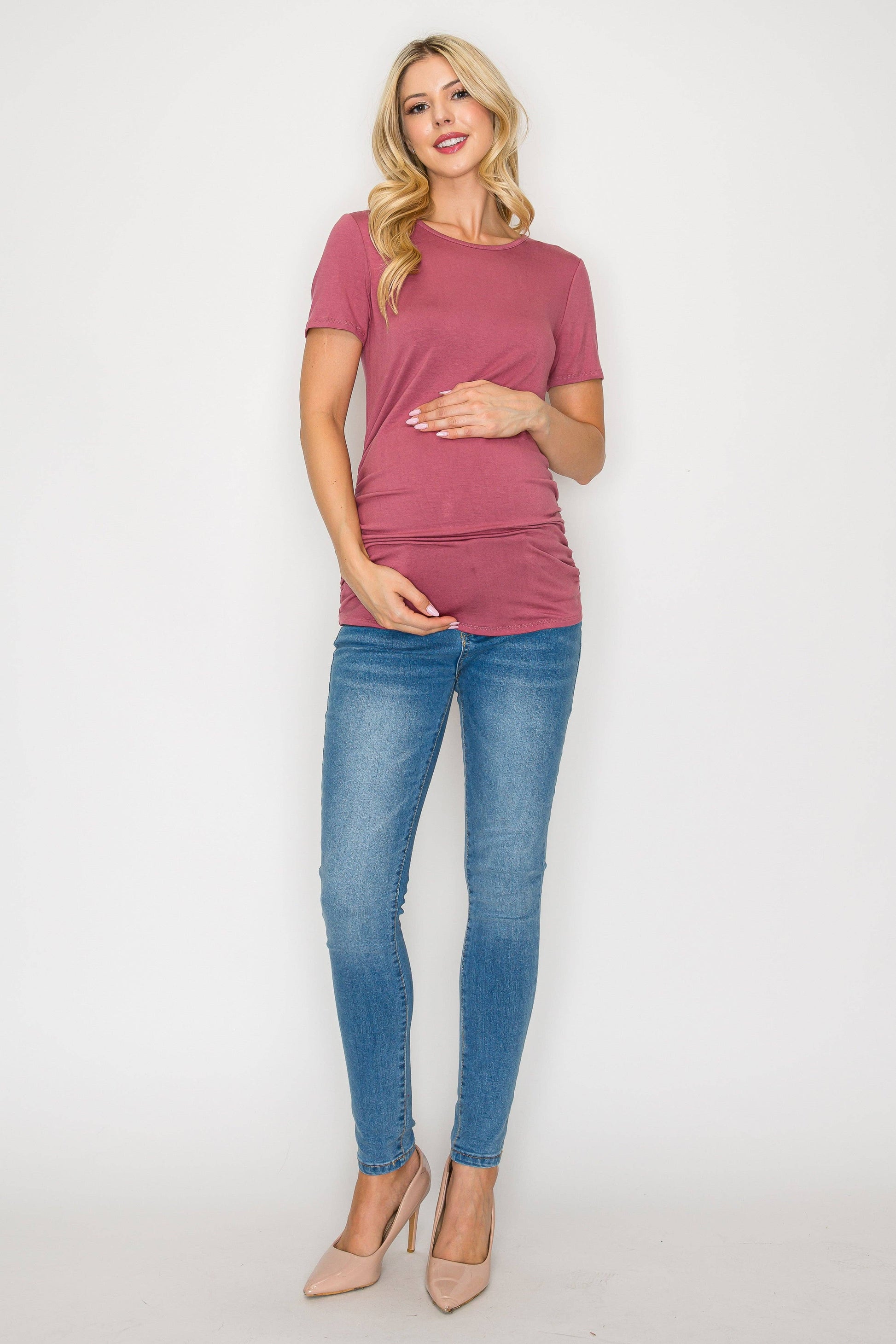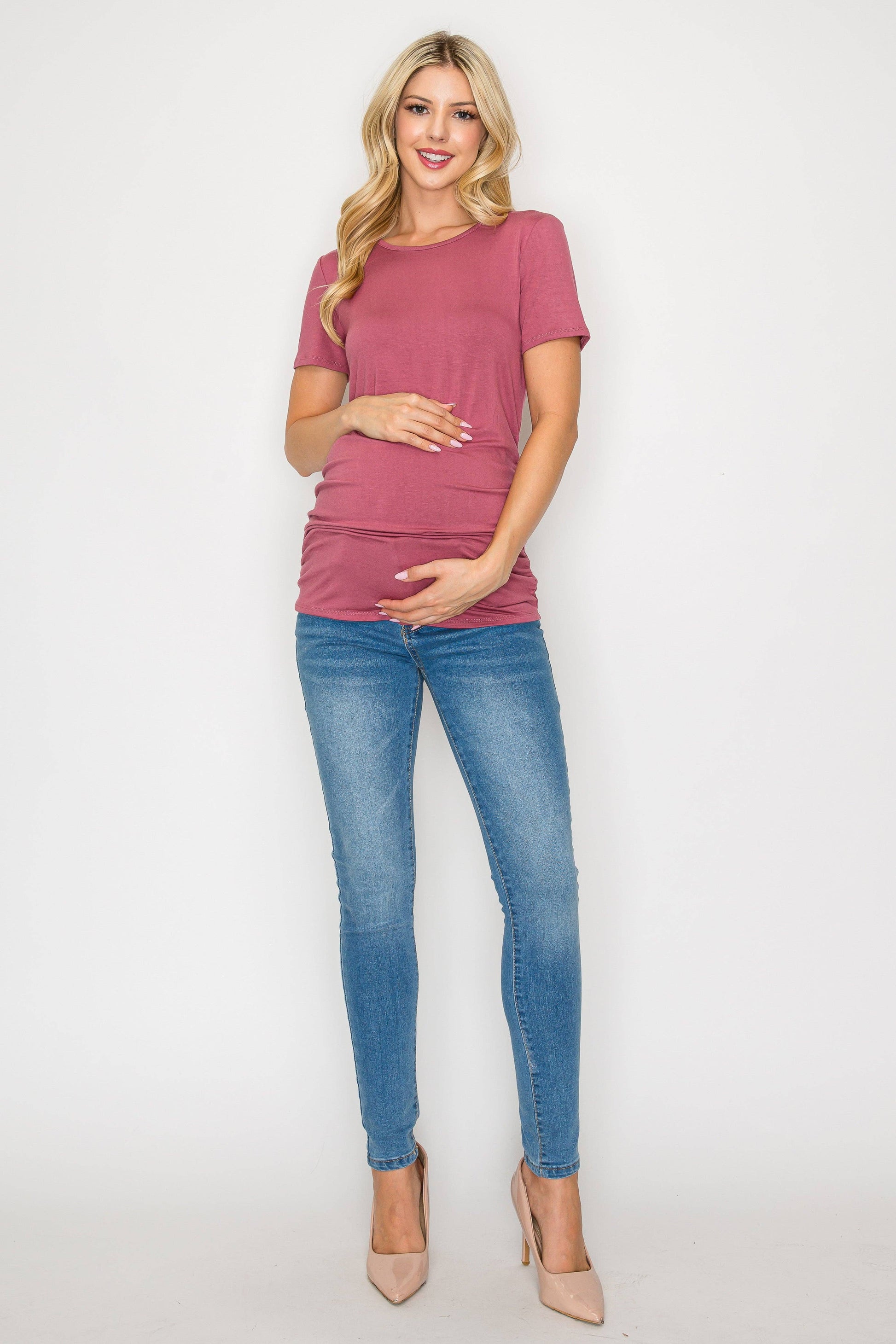 The Elisse Casual Short Sleeve Top W/Side Ruched is constructed of comfortable rayon that is stretchy, light, and breathable. Comfortable for any pregnant mama to wear all day long for any occasion. Specially designed for a comfortable daily wear. This top is loose enough around your bump making it comfortable to move in. Can be easily dressed up or down. You can wear this top to any occasion such as going to work, running errands, or when dining out.