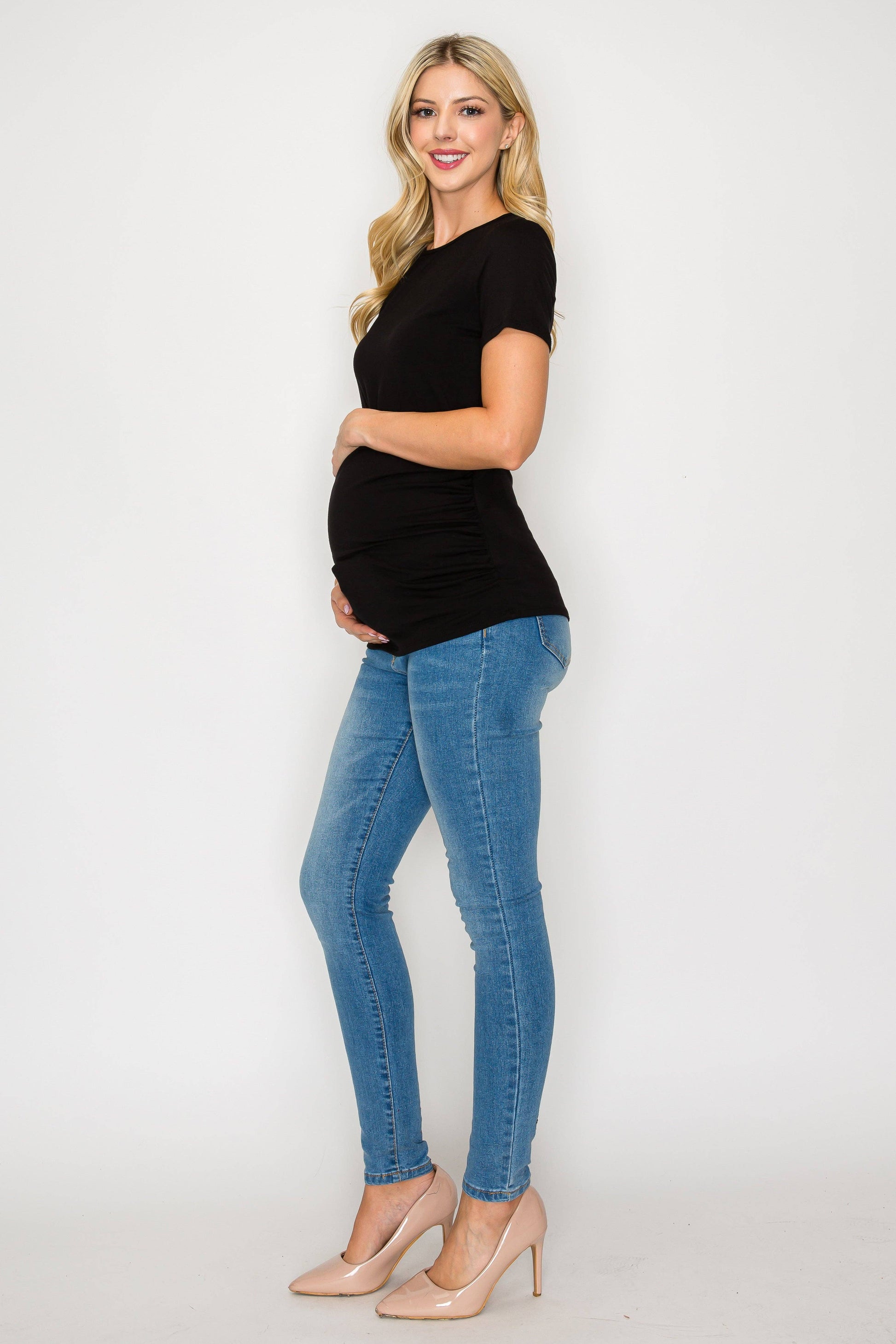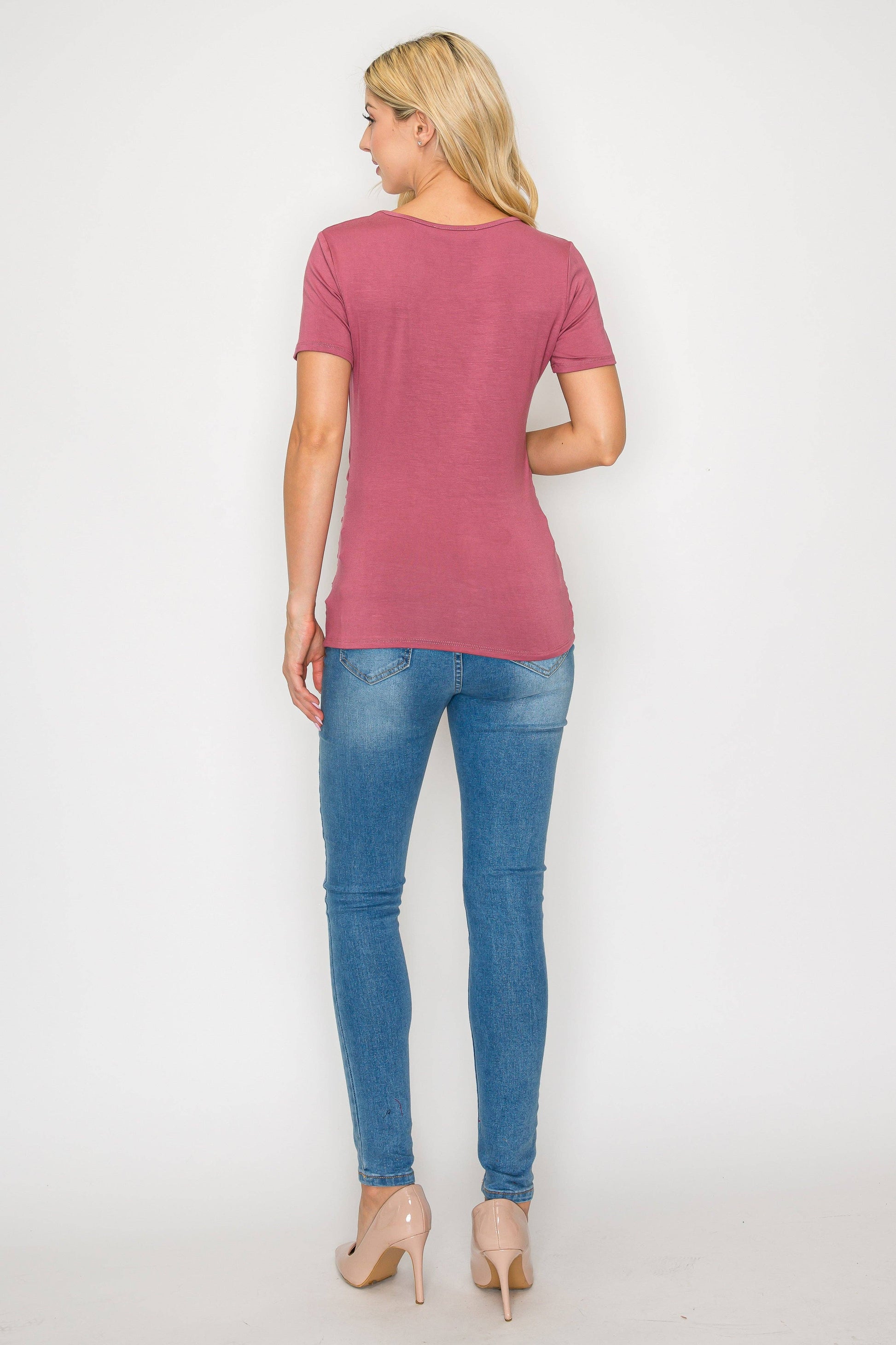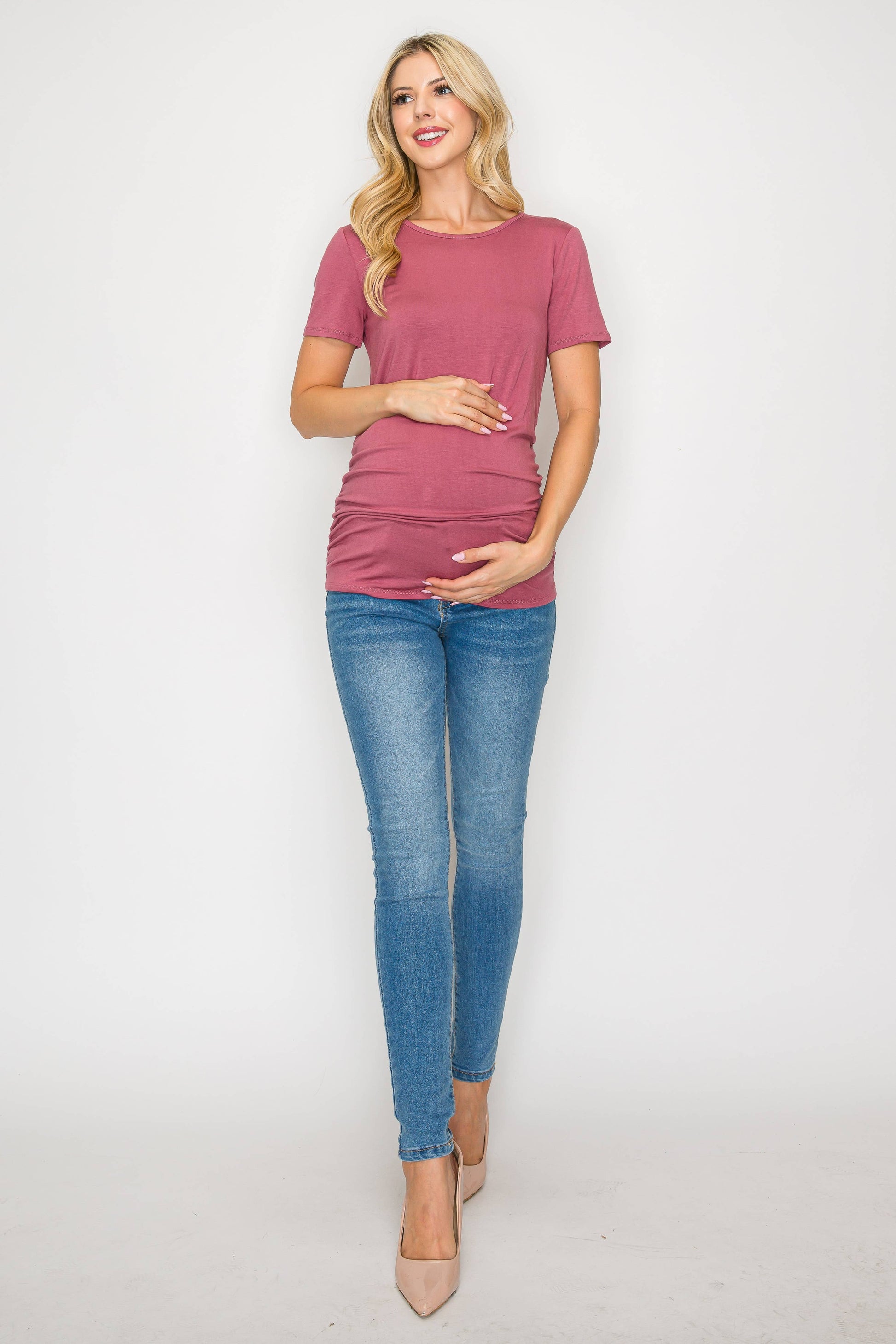 The Elisse Casual Short Sleeve Top W/Side Ruched is constructed of comfortable rayon that is stretchy, light, and breathable. Comfortable for any pregnant mama to wear all day long for any occasion. Specially designed for a comfortable daily wear. This top is loose enough around your bump making it comfortable to move in. Can be easily dressed up or down. You can wear this top to any occasion such as going to work, running errands, or when dining out.