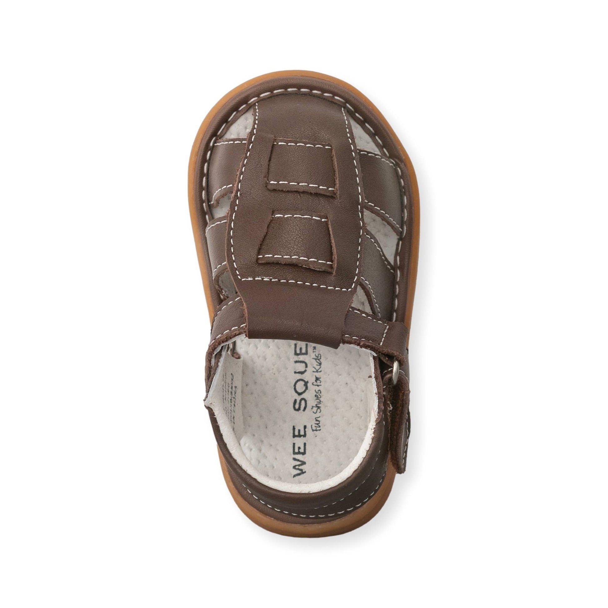 Naturally breathable genuine leather and sturdy construction make our closed-toe fisherman sandals perfect for your little adventure seeker! Made of brown leather with white contrast stitching, padded heel collar, supportive footbeds, and adjustable hook and loop straps. They’ll enjoy playing in them and you’ll love their durability and convenient on/off style.