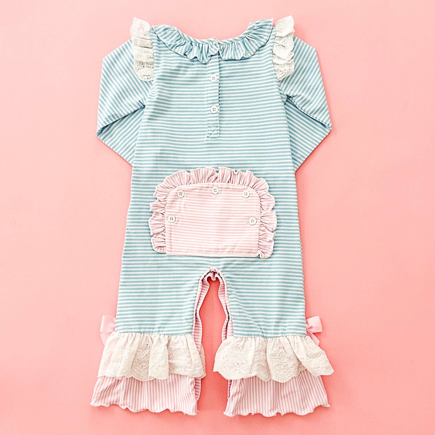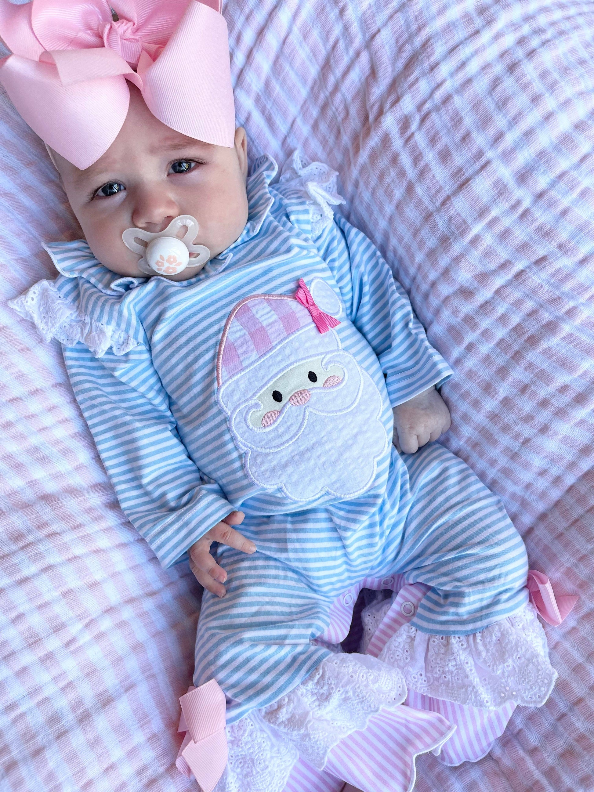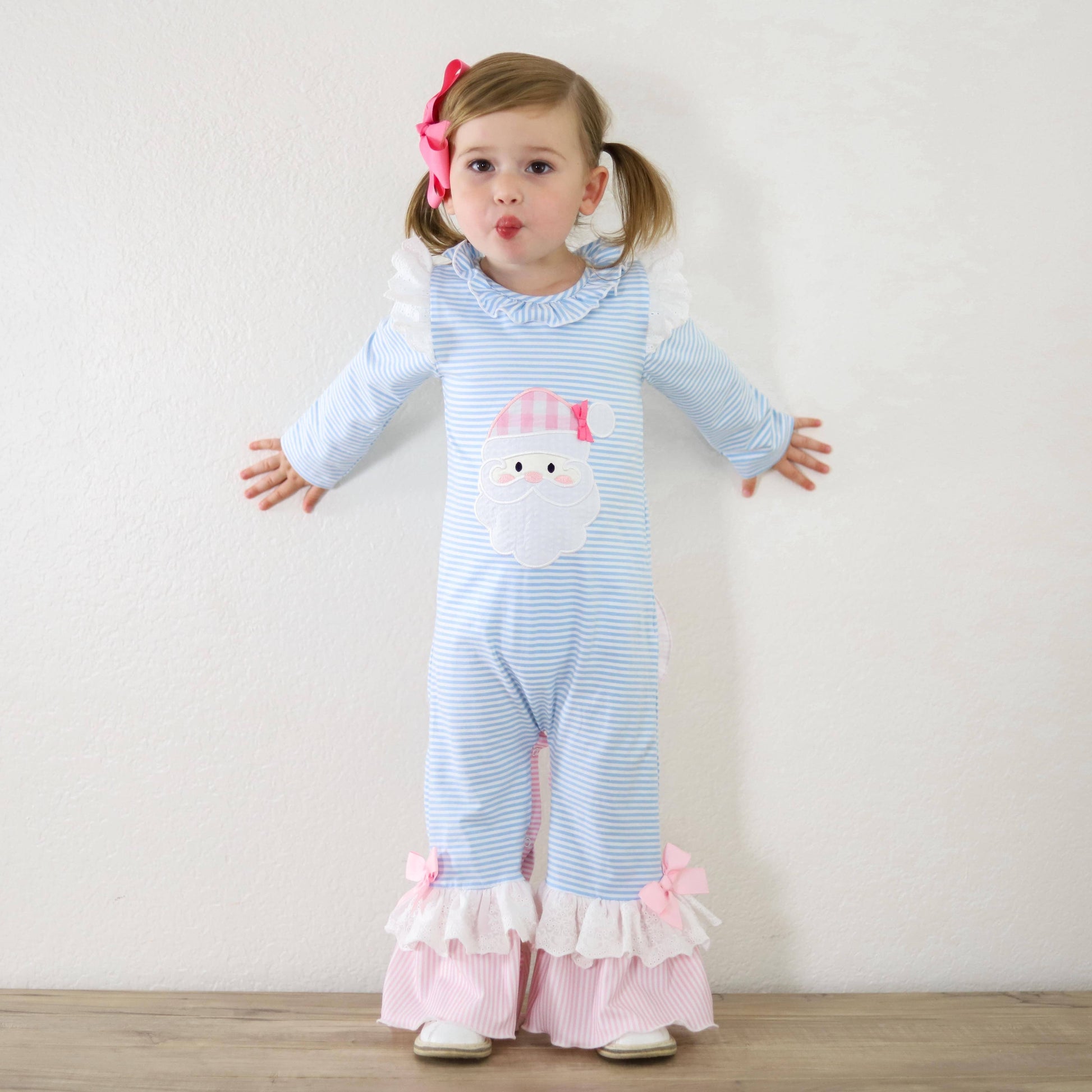 Comfy, cute and soft as can be! Our Christmas Santa Romper features a pastel twist on our favorite holiday. Chest features and applique Santa, bum has an adorable faux bum flap with ruffles. Accents of eyelet and ruffles complete this sweet and festive romper!