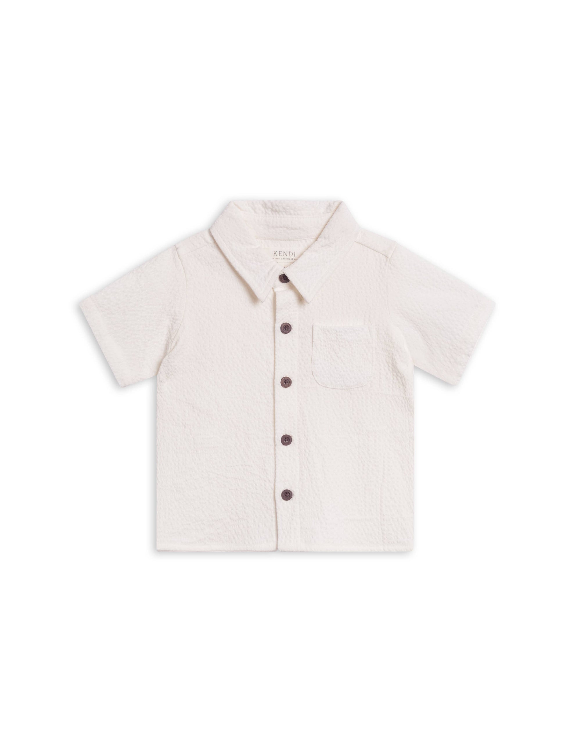 Keep your little one cool and stylish with this coconut-colored seersucker shirt! Made from soft organic cotton with a touch of stretch, it features a neat collar, chest pocket, and pleated back. Durable, comfy, and easy to care for—just toss it in the wash and tumble dry low. Perfect for sunny days and playful adventures!