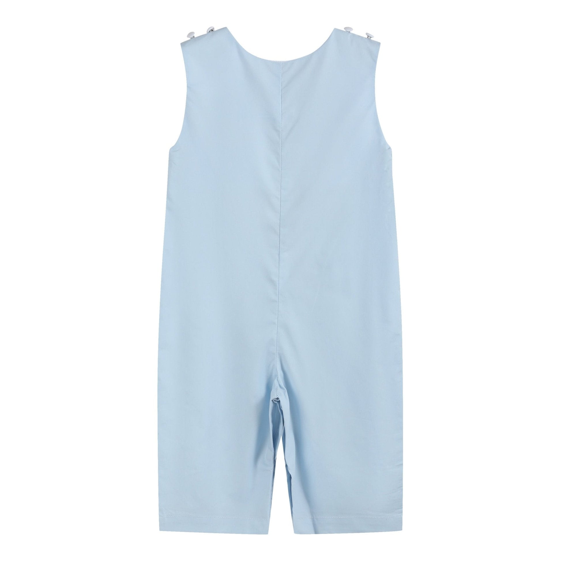 Perfect for Easter or church, these Light Blue Crosses Smocked Overalls feature delicate smocking with embroidered blue crosses on the front. Crafted in a serene light blue, the outfit not only exudes sweetness but also offers practicality with snaps at the crotch for easy diaper changes and adjustable sizing buttons at the shoulder. Elevate your baby boy's style for special occasions with this timeless and adorable ensemble.