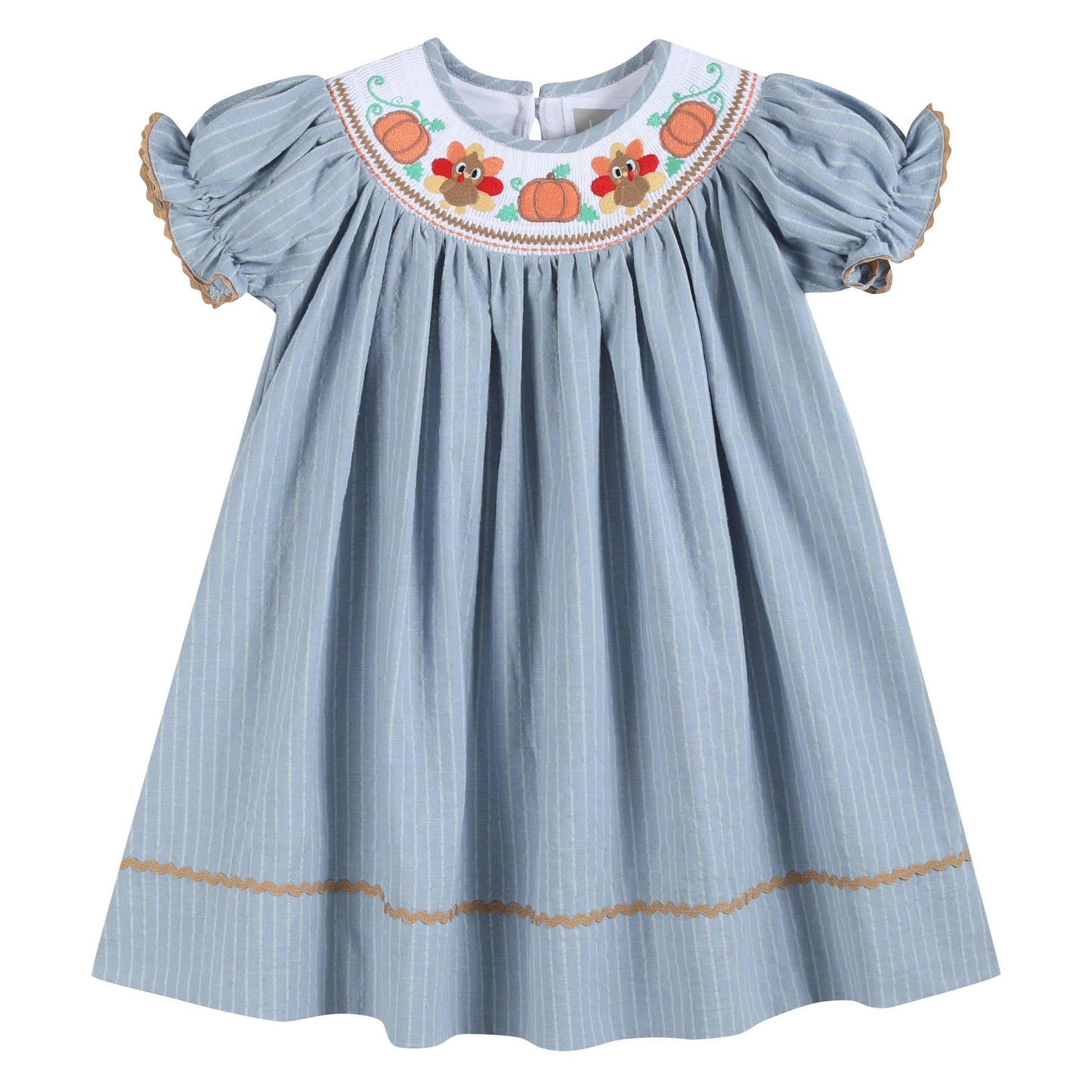 This Light Blue Pinstripe Turkey Smocked Bishop Dress is perfect for the Fall and Thanksgiving season. The smocked neckline showcases embroidered pumpkins and turkeys, adding a festive touch. Made from 100% soft cotton, it offers both comfort and style. The pretty brown rick-rack trim and classic bishop length create an elegant look that falls to mid-calf/ankles, making it a timeless choice.