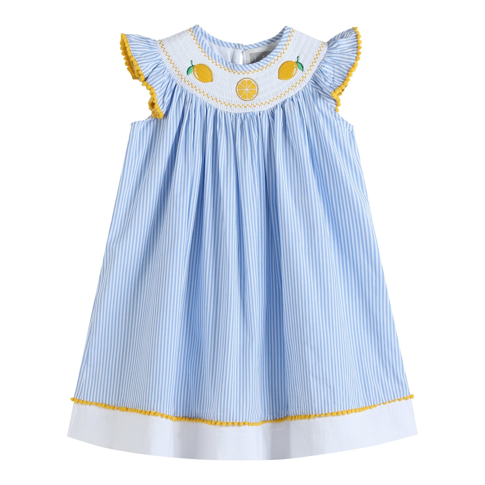 Adorable and sweet! This smocked dress is made in a pretty light blue stripe print featuring lemon embroidery. The perfect choice for backyard BBQ's, days at the beach or a playdate.