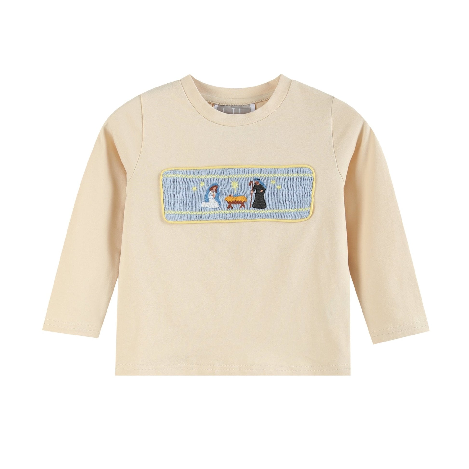 Elevate your little one's style with our Light Brown Nativity Smocked Shirt and Blue Pants Set! The smocked panel features a beautifully embroidered nativity scene, adding a touch of warmth to the ensemble. Perfect for festive occasions, this set combines comfort and charm for your little gentleman.