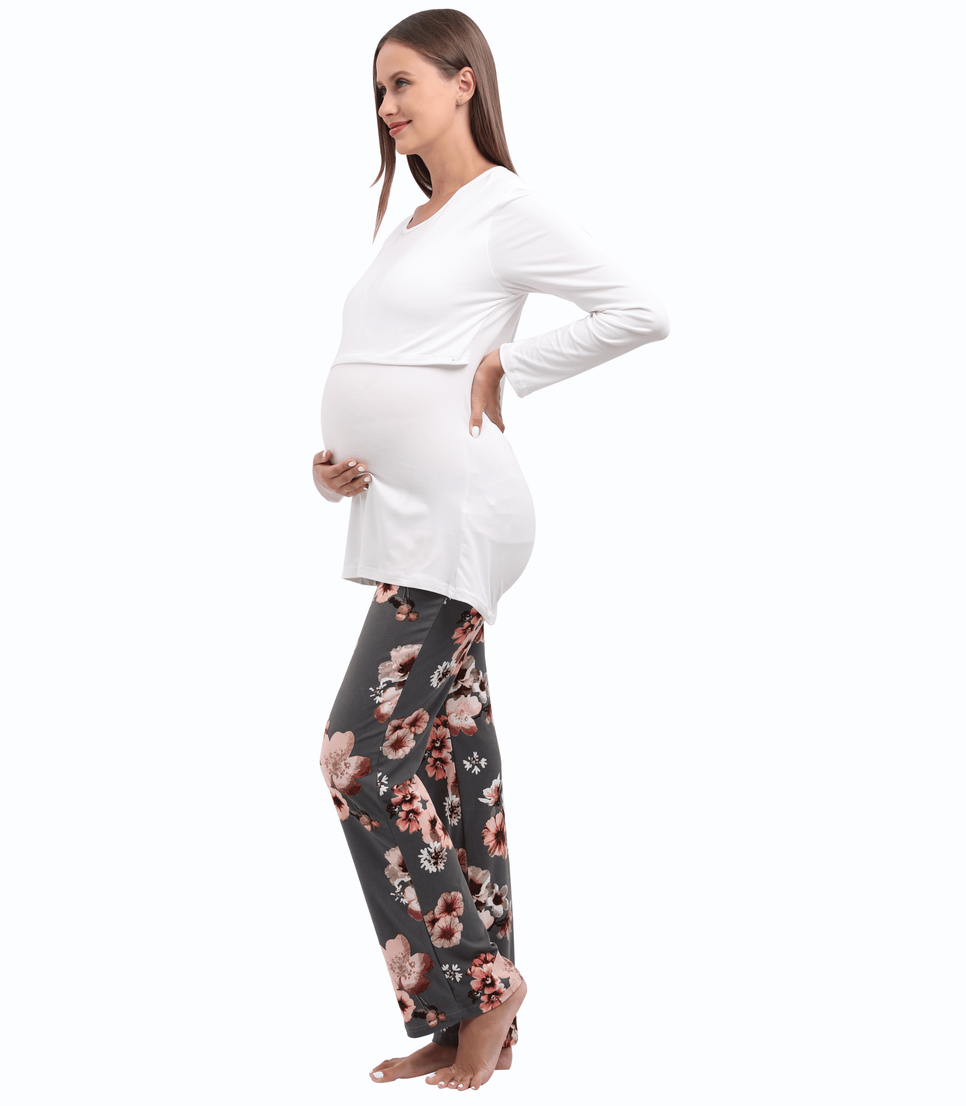 Our favorite pajama pants paired with its matching long sleeve maternity/nursing duo use shirt! This set offers a below bump pajama pant that will never restrain your growing belly or interfere with c-section incisions. It also comes with a bump friendly long sleeve white nursing shirt that can be used during pregnancy and postpartum. Super super soft material for you to cuddle with your baby.