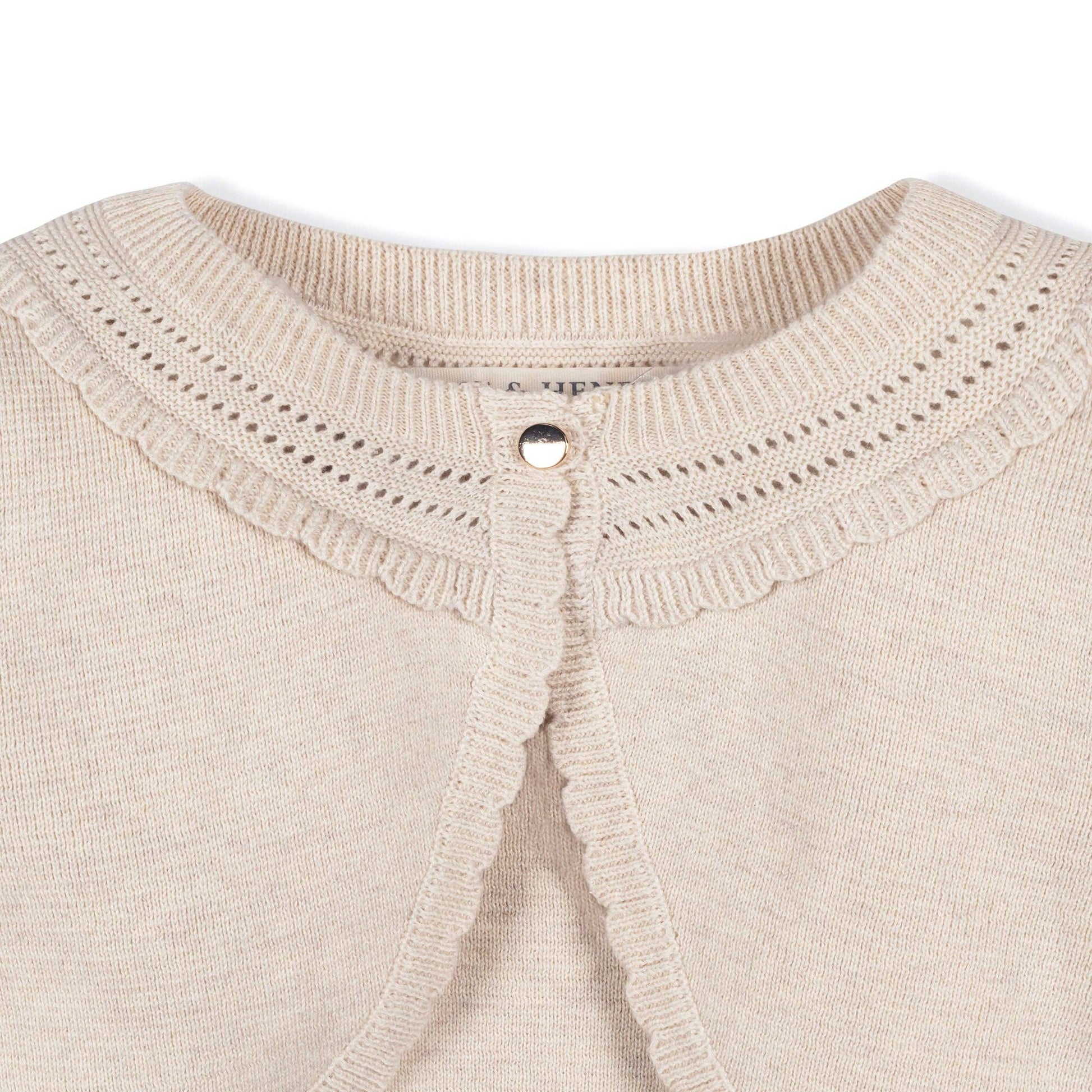 A beautiful layer to top off her dressy outfits. Our cropped cardigan sweater is knit in fine gauge organic cotton with full fashioning at armholes and a pointelle pattern throughout. Features delicate pearlized buttons.