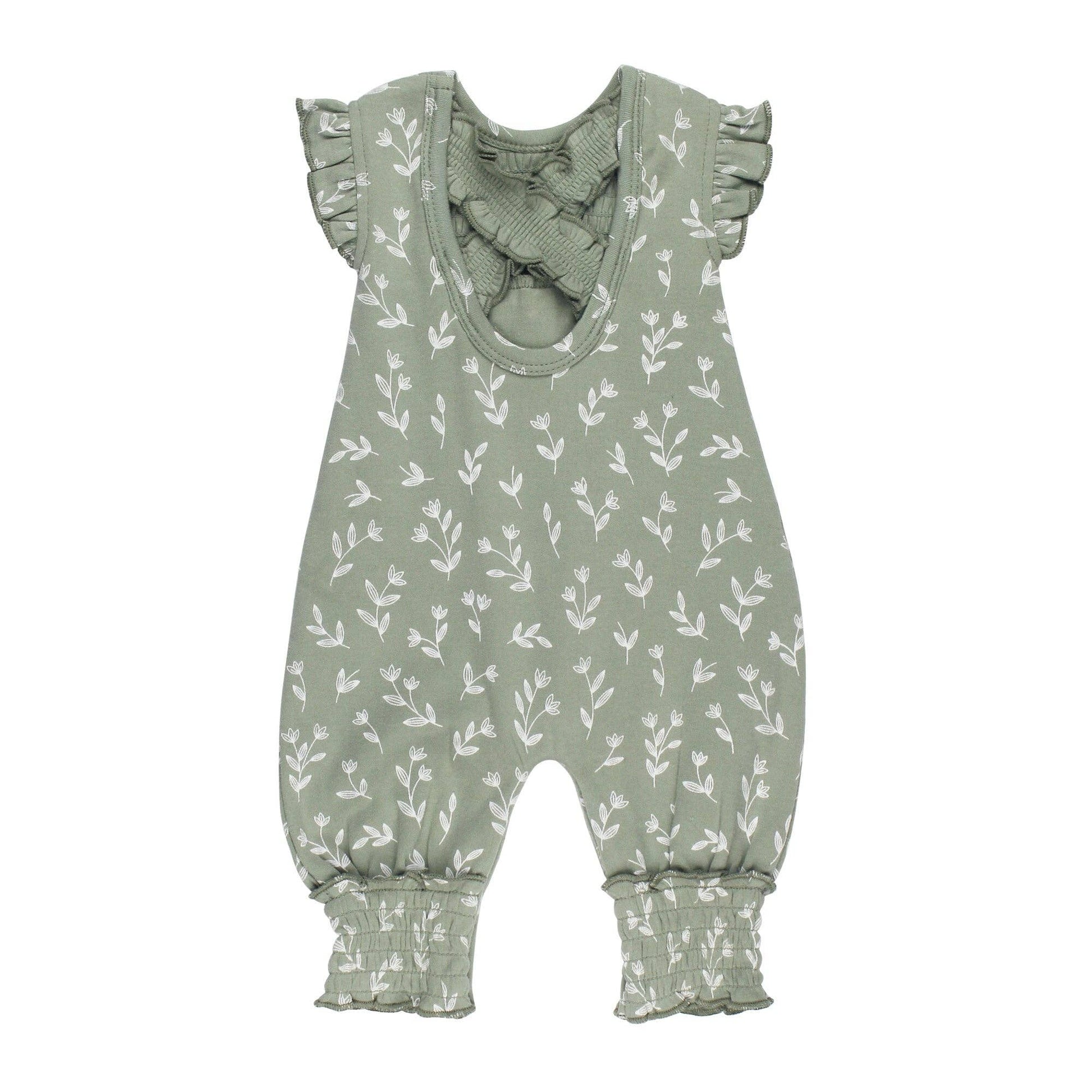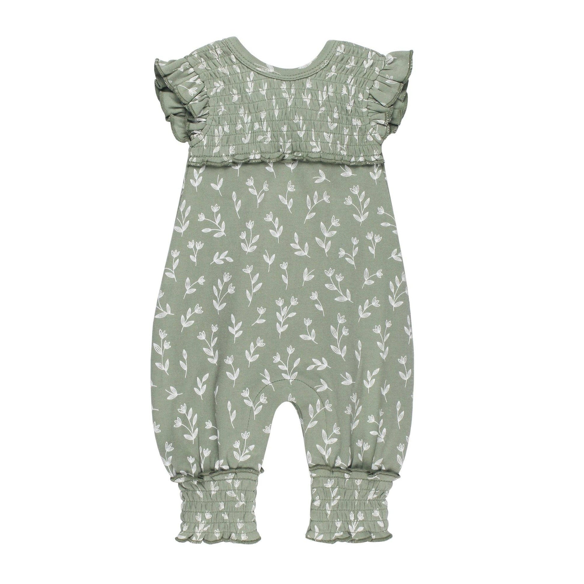 Organic Cross-Back Smocked S/Sleeve Romper in Seafoam Bloom