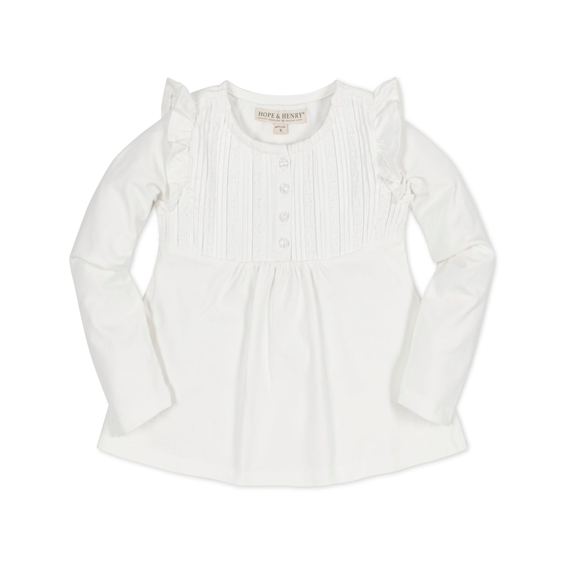 Our wear-with-anything knit top is the stylish essential she won't want to take off. Crafted from a soft and stretchy organic cotton jersey blend, this top features flutter details at the shoulders, pintucking at the yoke, and a button front placket. Beautiful layered with skirts and leggings.