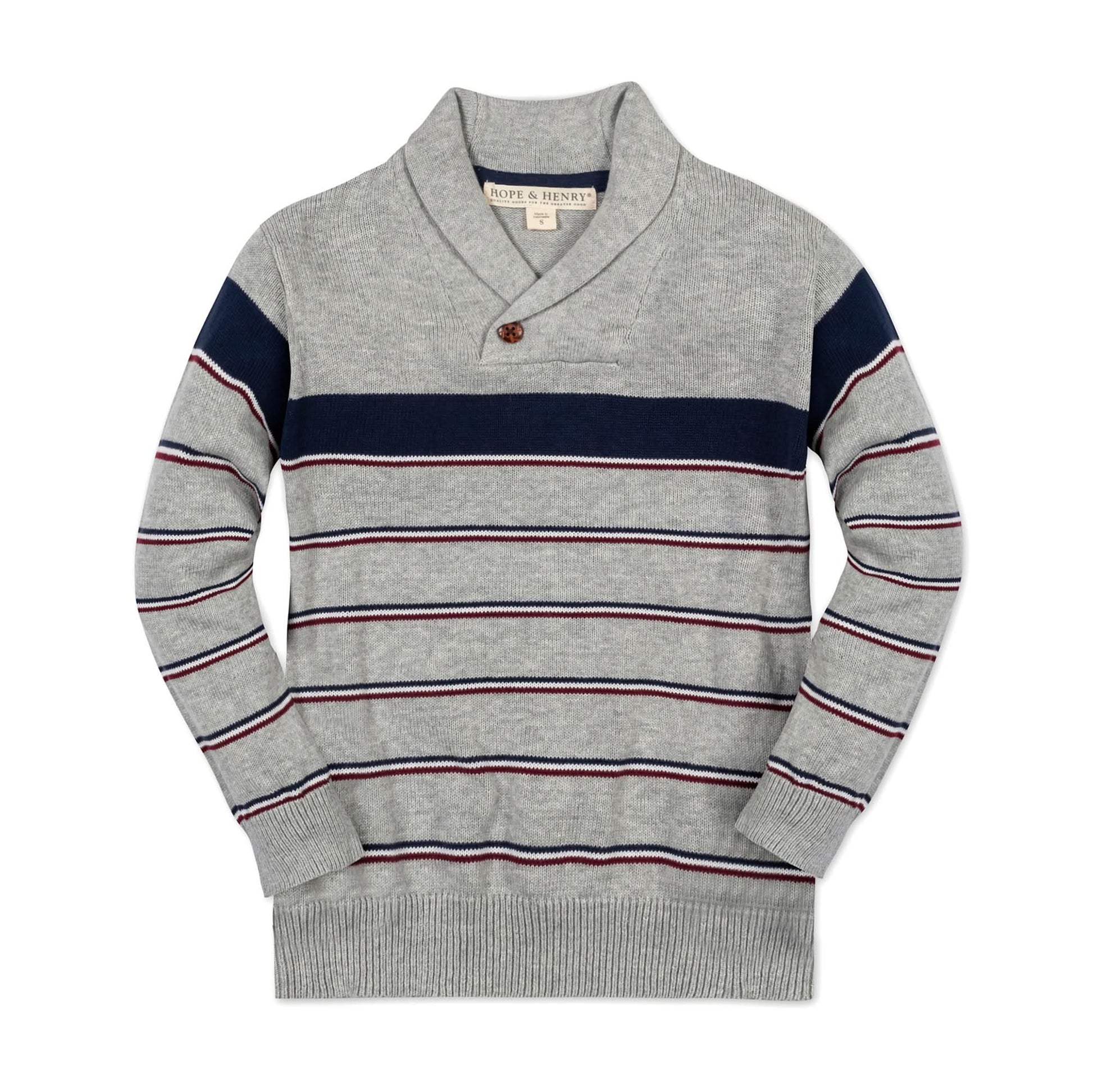 Our shawl collar sweater in soft organic cotton is the ultimate in comfort and style for your guy. Special attention to details such as the shawl collar with button closure and interesting stripe placement make this an instant classic that can be worn on repeat and handed down time and again.