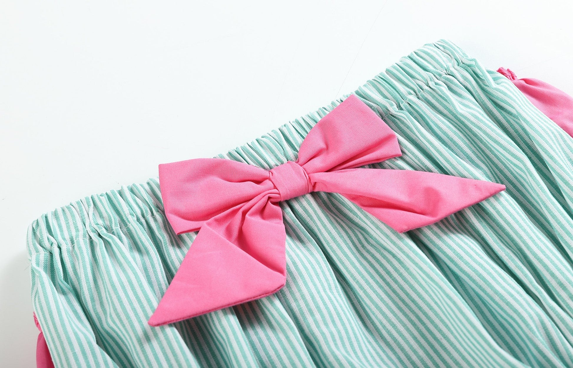 Add a pop of playful pink and green to your little girl's wardrobe with our watermelon-themed top and ruffle bloomer set. Featuring a charming ruffle bottom and pretty pink bow detail, this outfit is perfect for a sweet summer look.