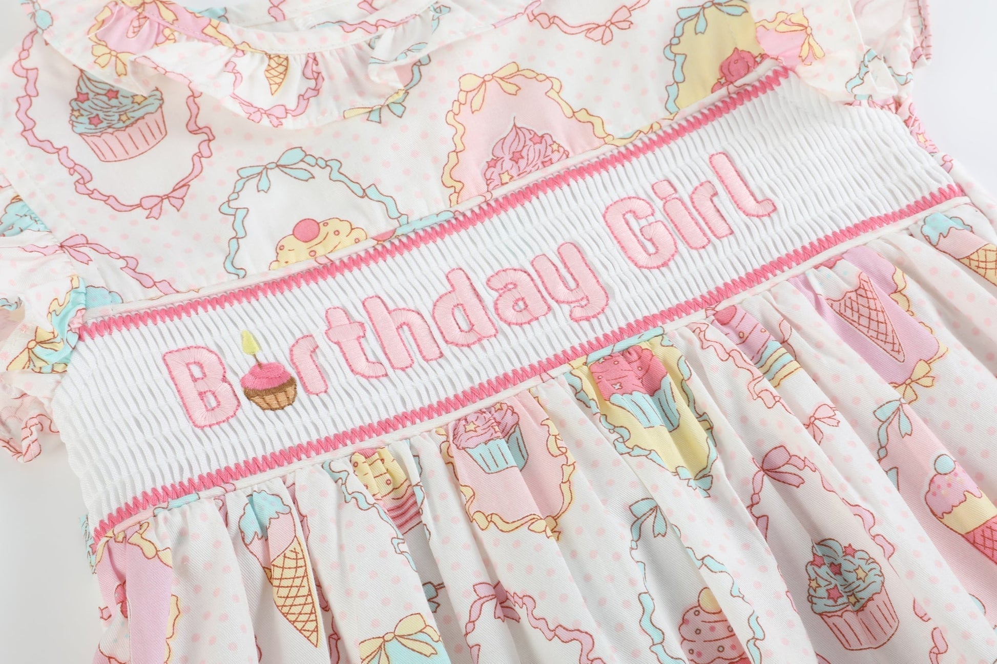 Introducing our "Pink and White Birthday Girl Smocked Dress"! Perfect for your little one's special day, this enchanting dress features delicate smocking adorned with embroidered 'Birthday Girl'. Complete with a charming sash for a big bow and a sweet ruffle collar, it's the ultimate outfit to make her birthday celebrations even more memorable!