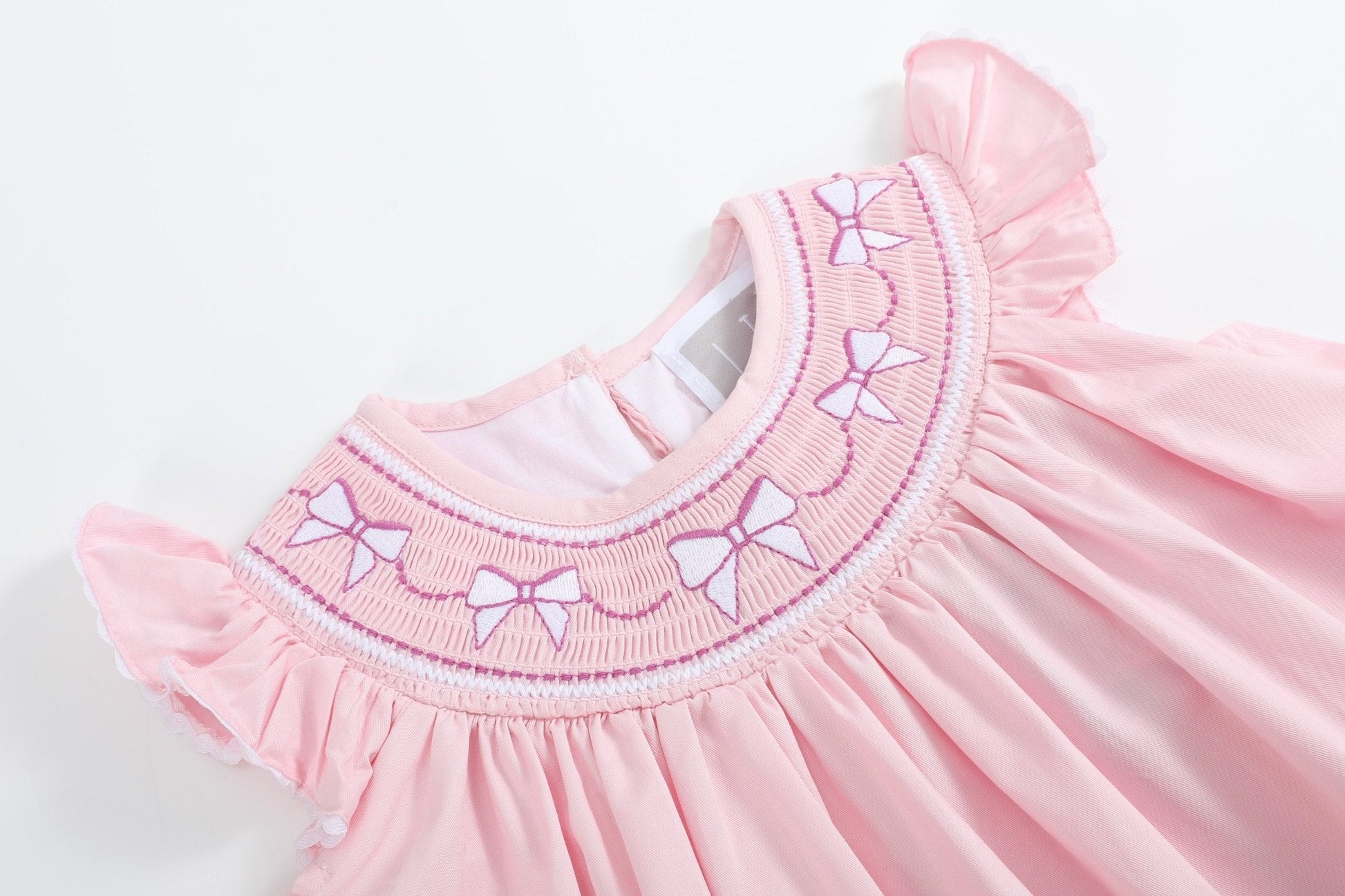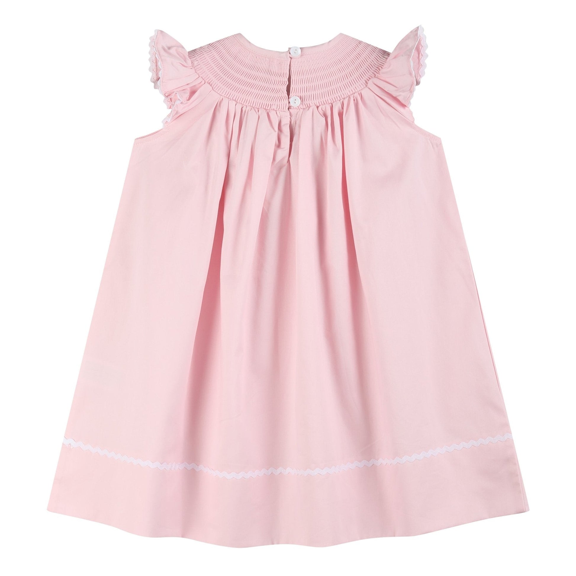 Sweet and classic, our Pink and White Bows Smocked Bishop Dress is a timeless favorite for little girls. Made from soft pink cotton, this dress features delicate hand-smocking along the neckline with beautifully embroidered white bows. The traditional bishop silhouette offers a comfortable, flowing fit that falls to mid-calf/ankle length, perfect for special occasions or everyday charm. Finished with pretty rickrack trim and darling flutter sleeves, it’s a perfect piece for spring, summer, or any moment worth dressing up for.