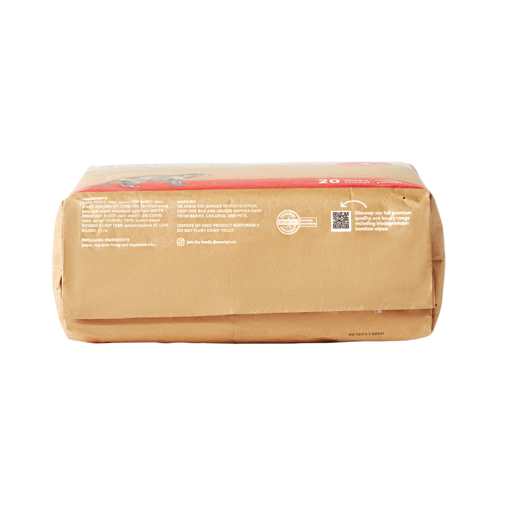 Diapers are presented in paper compostable packaging, all carbon is offset and each order contributes to re-forestation projects, the plastic impact with Ecoriginals is zero.