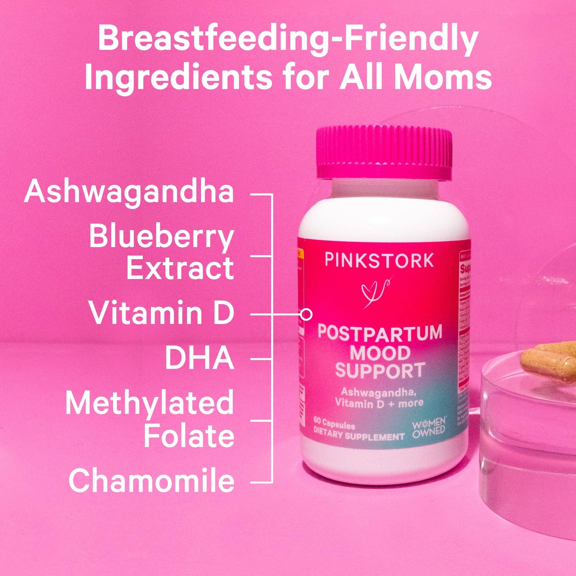 Postpartum Emotional Balance: After labor and delivery, your hormones are constantly bouncing up and down. Pink Stork Postpartum Mood Support provides an exclusive blend of organic Ashwagandha, Omega 3 DHA, and Chamomile with essential vitamins and nutrients including Vitamin D, Folate, Vitamin B6 and B12 to support hormonal balance for women.