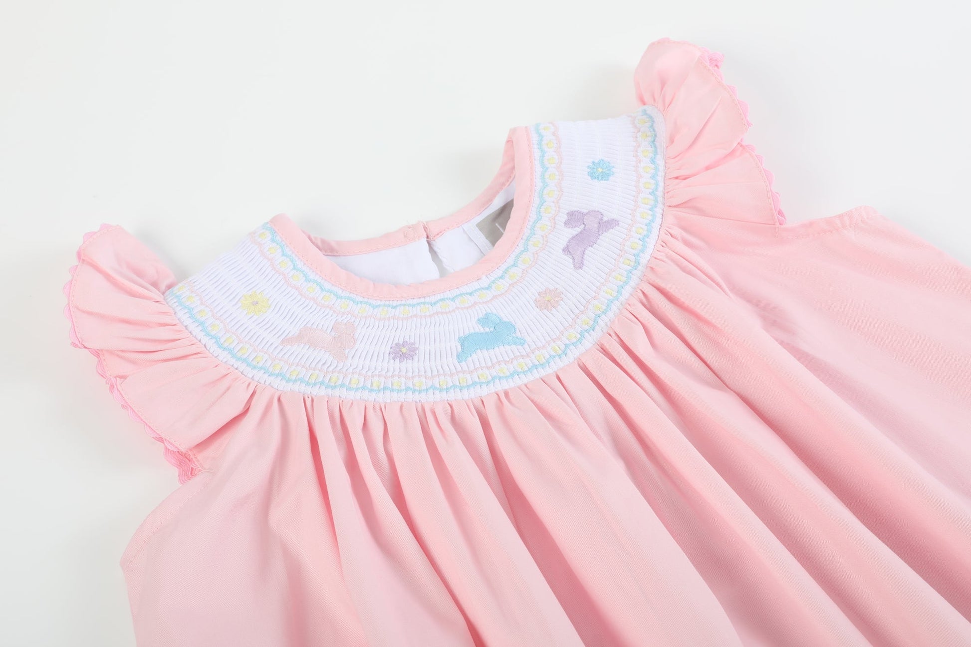 Hop into style with our Pretty Pink Easter Bunny Smocked Bishop Dress! This delightful dress features a smocked neckline and adorable embroidered bunnies, making it the perfect pick for your little fashionista's Easter celebrations. Made in a pretty soft pink cotton, it's not just pretty but comfortable too! Dress your sweet girl in this perfect Easter dress for a look that's both egg-stra special and egg-stremely cute.
