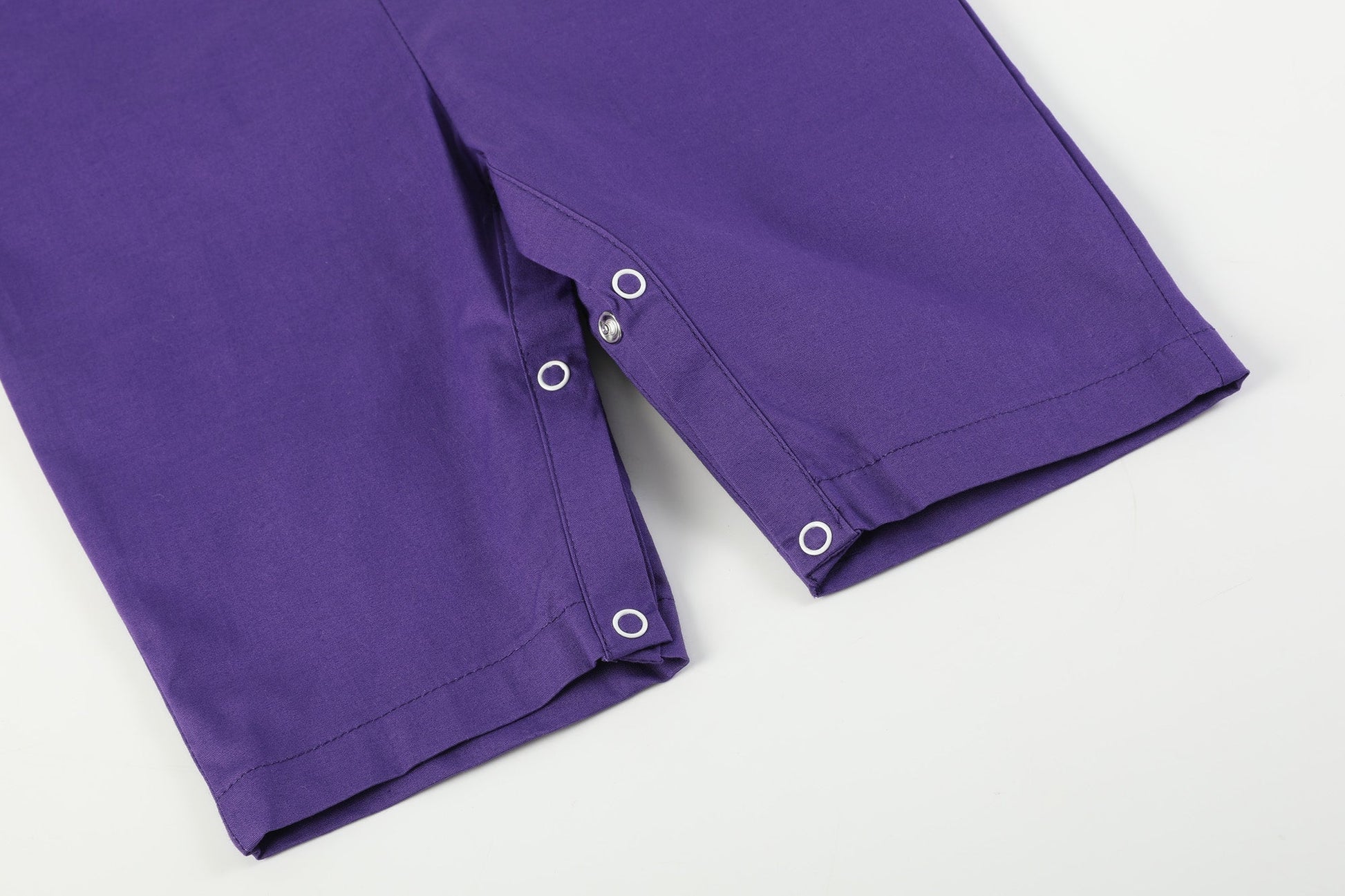 Get ready for a touchdown of cuteness with our Purple and Gold Football and Tiger Smocked Overalls! Featuring adorable smocking on the chest and playful embroidery of footballs and tigers, this outfit is a winning play for your little quarterback. Kick off the fun with style in these charming football-themed overalls, perfect for your tiny sports enthusiast