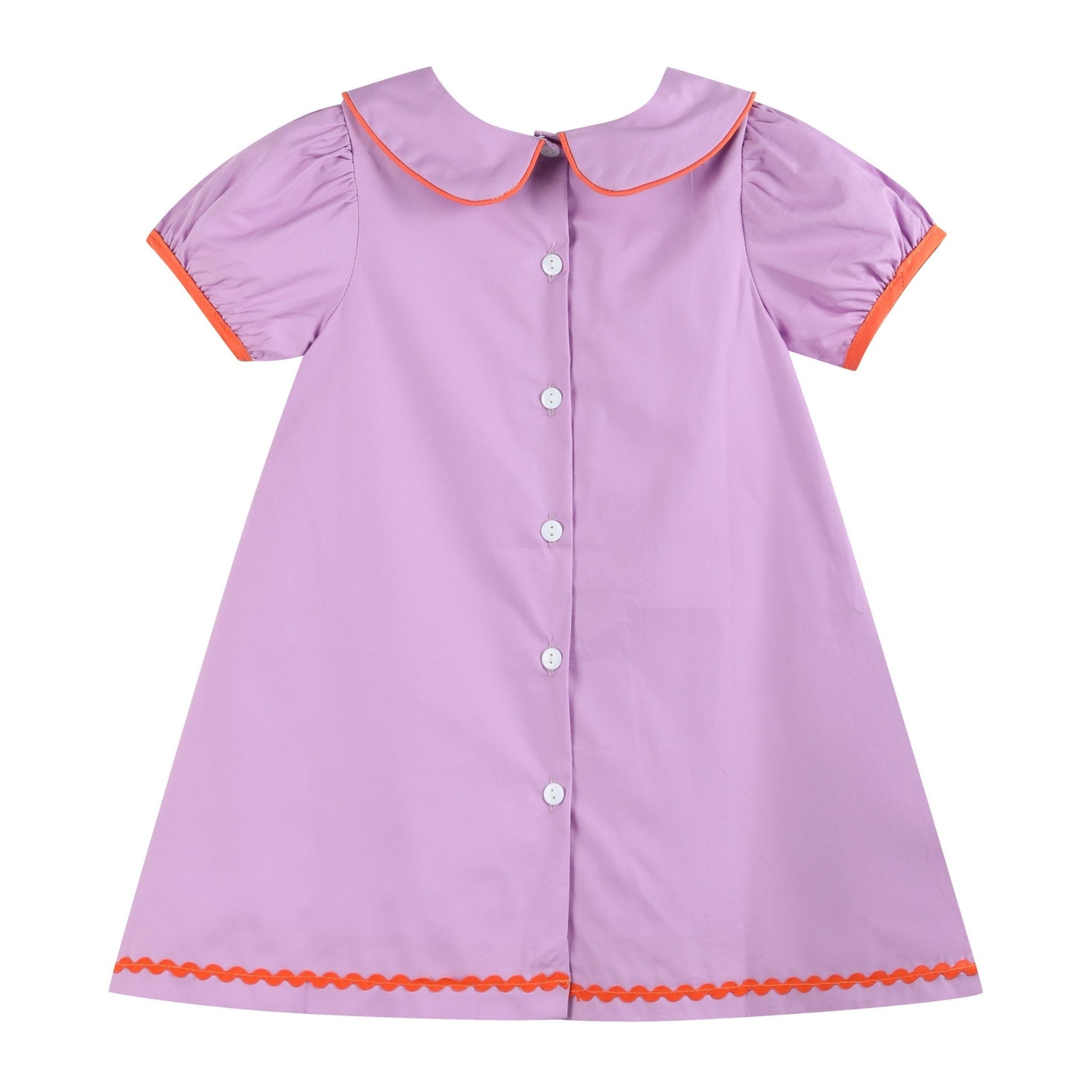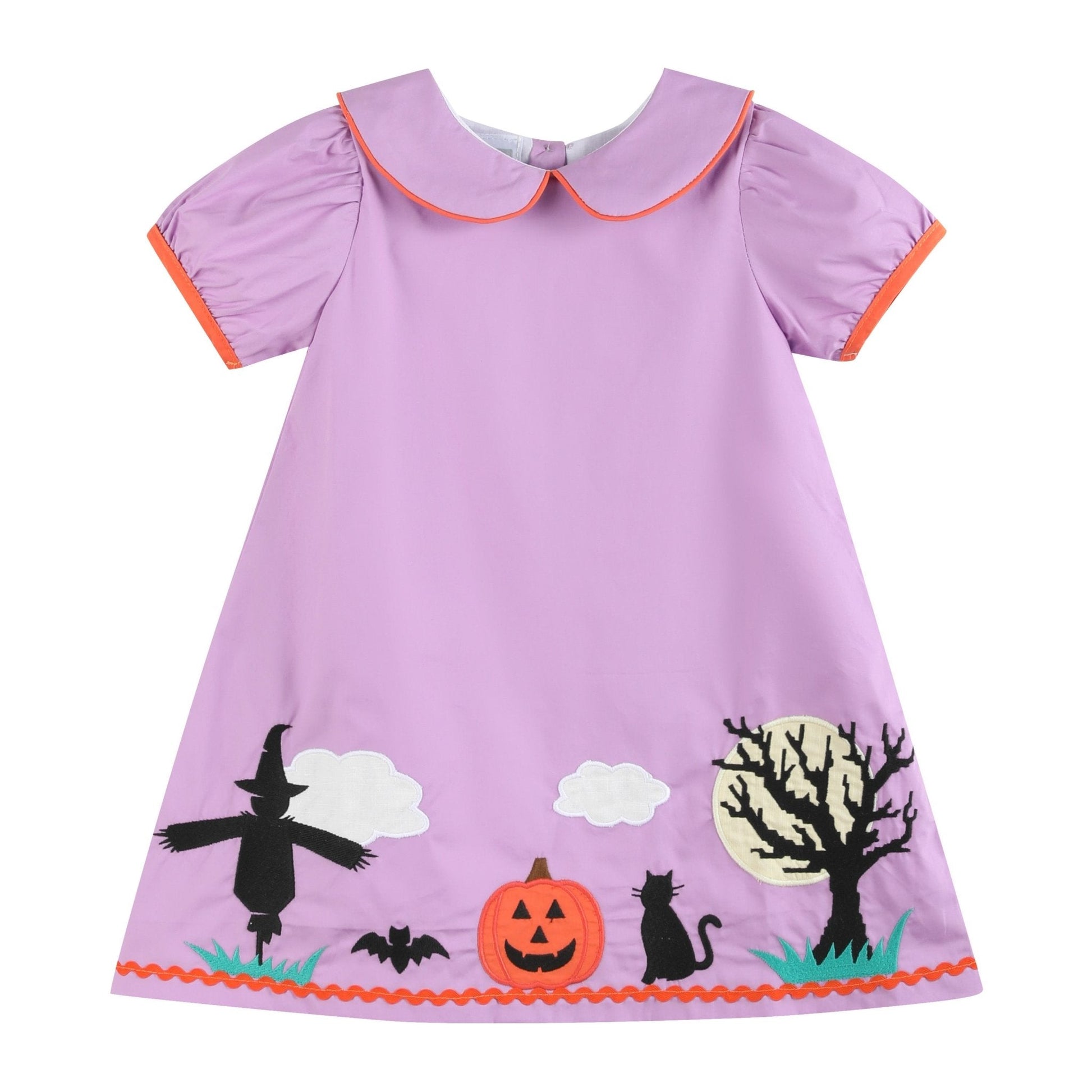 Get your little one ready for Halloween in style with our Purple Halloween Scene Girls Dress! This dress features a charming applique of a spooky Halloween scene, this dress is perfect for spooky fun. The classic peter pan collar adds a touch of elegance, while the button-up back ensures easy styling and a comfortable fit. Designed for babies, toddlers, and girls, this dress is ideal for Halloween parties, trick-or-treating, and festive family gatherings.