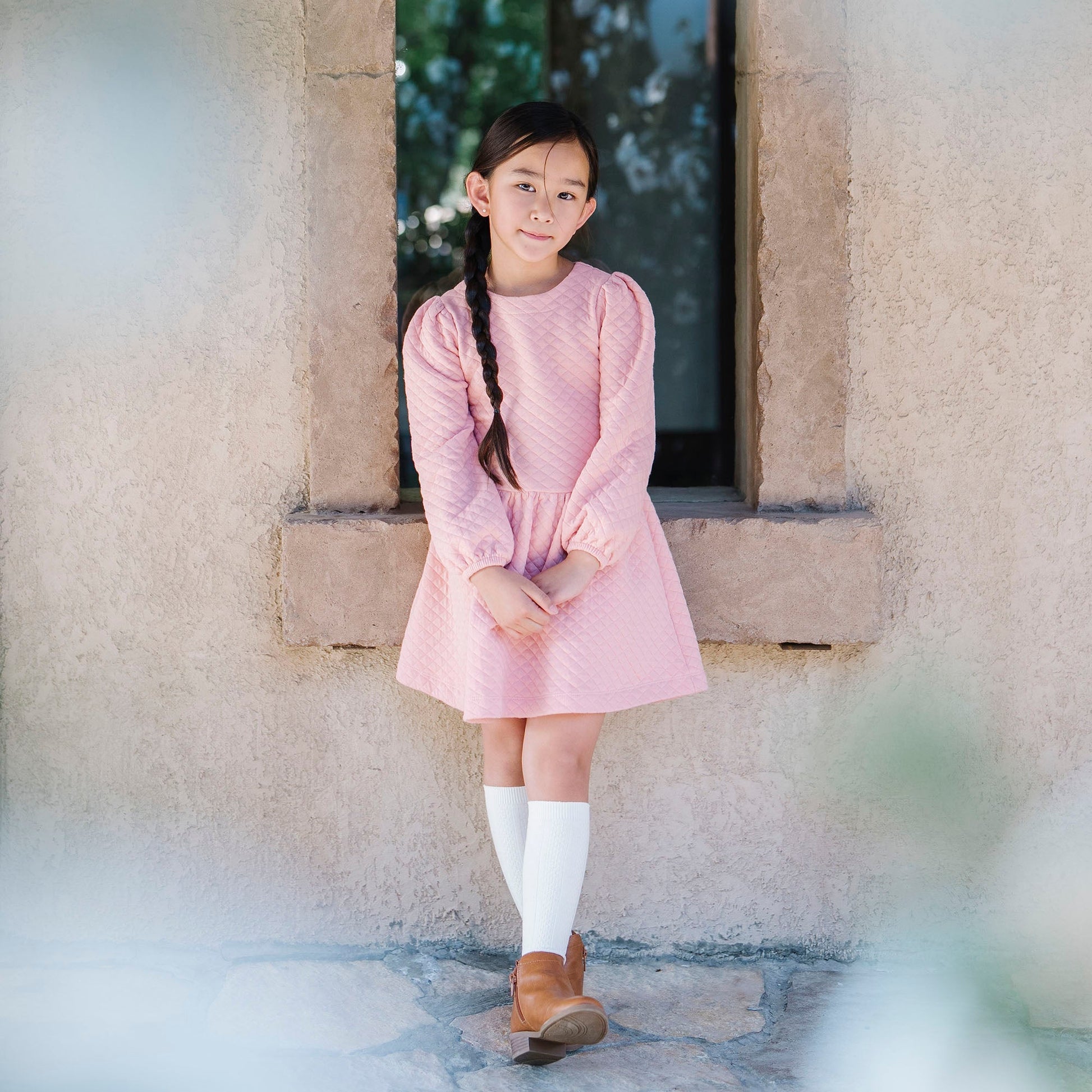 It's all about a beautiful silhouette and subtle texture in our gorgeous quilted drop waist dress. The pretty peasant sleeves and gold button closure down the center back lend a sophisticated feeling, while the organic cotton blend knit fabric is so soft and comfortable to wear. A piece she will love to wear.