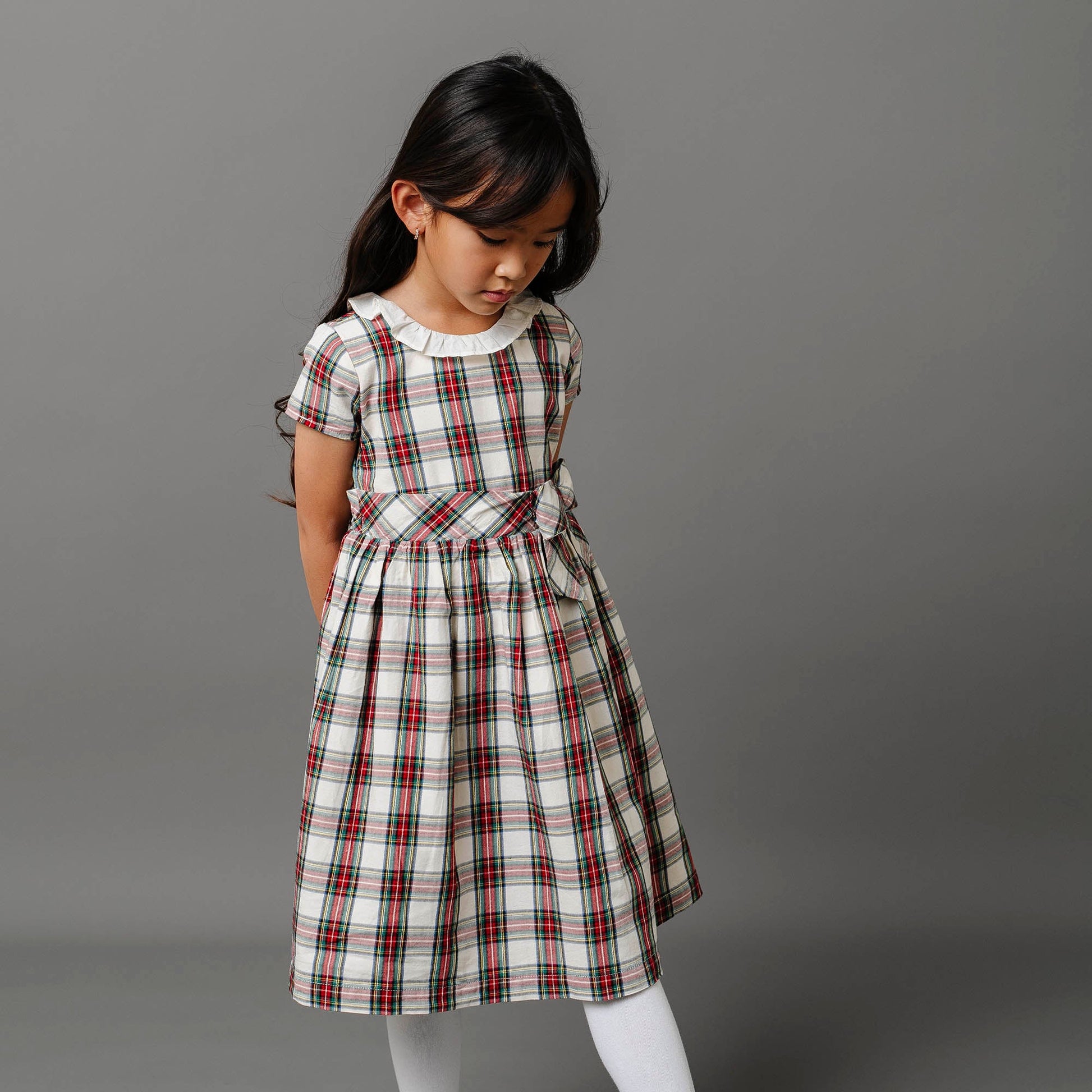 Talk about making an entrance this holiday! Cut from soft organic cotton in a timeless silhouette, this pretty dress will be your girl's go-to piece for picture time. Features a ruffle collar, sweet cap sleeves, and a waist sash with bow. Fully lined with a zipper closure down the center back for easy dressing.