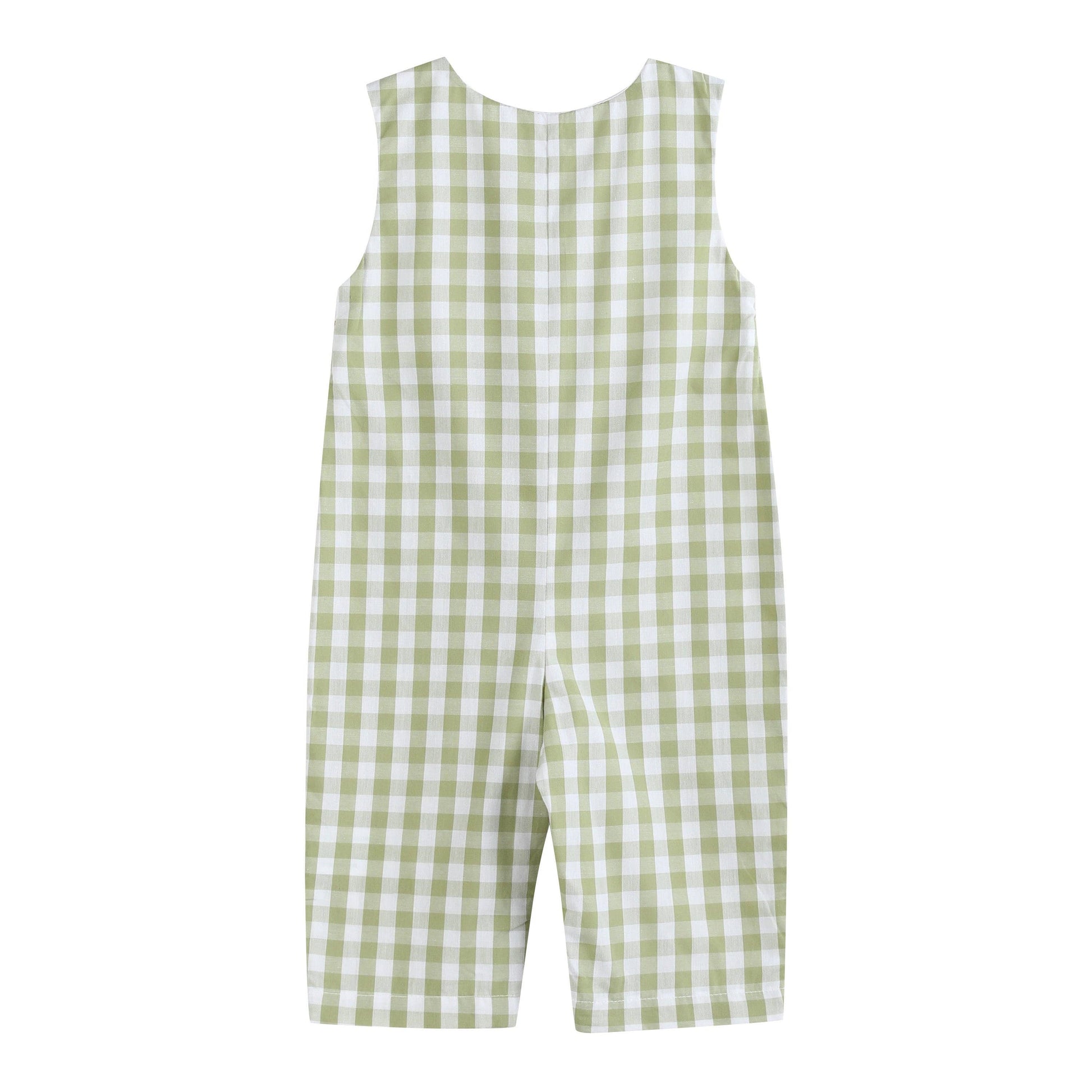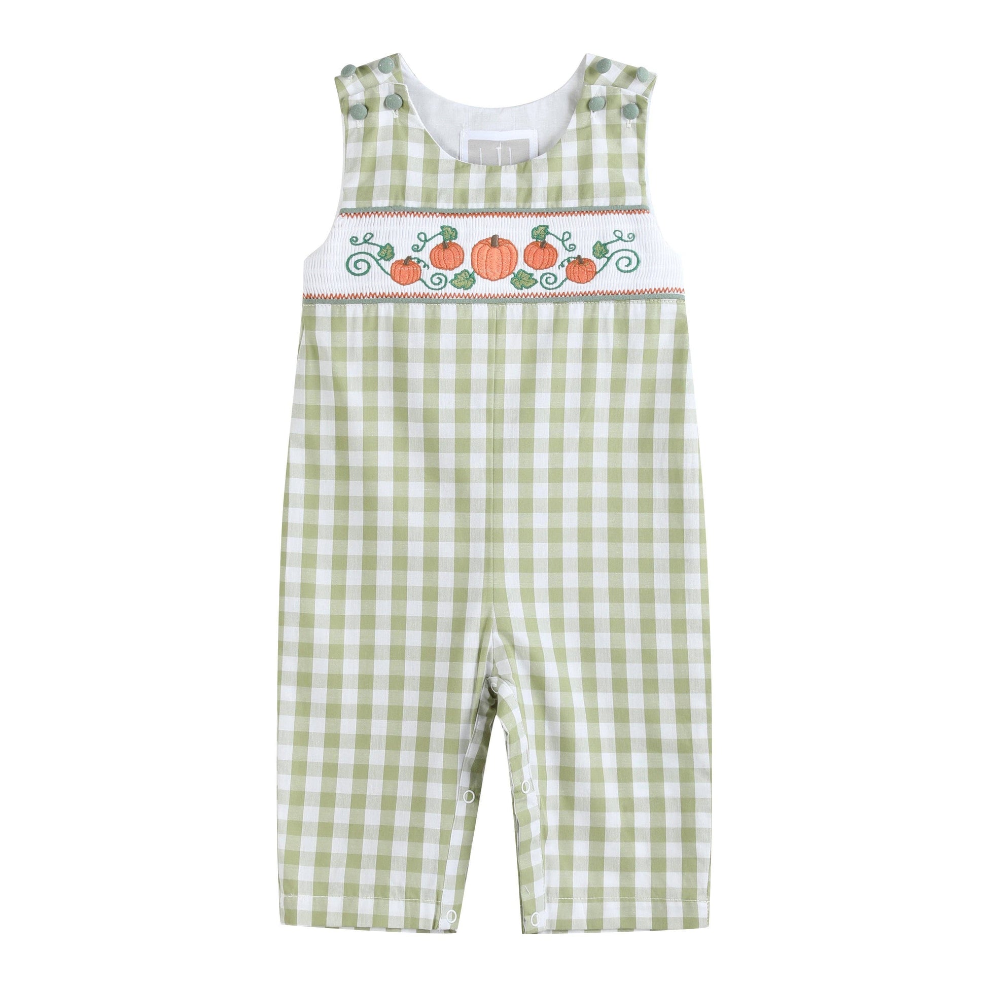 Your little pumpkin will look adorable in these Sage Green Gingham Pumpkin Smocked Overalls. Made from 100% cotton, this classic fall style features a smocked panel with embroidered pumpkins and a soft sage green gingham fabric. Adjustable shoulder buttons provide room to grow, while snaps at the crotch make changes easy and quick.