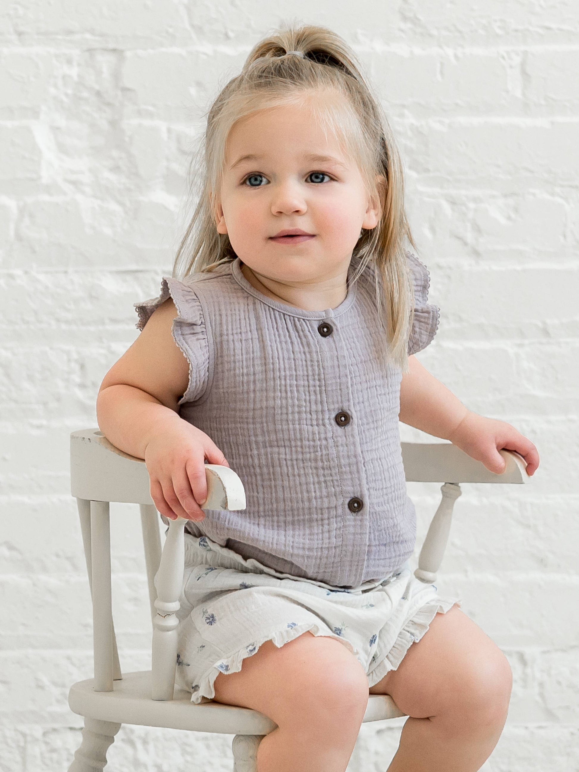 The Tessa Muslin Top is a sweet and comfy choice for your little one. Made from soft organic cotton muslin, it features cute wooden buttons and ruffle sleeves with delicate stitching. Perfect for sunny days and playtime, it keeps your child cool and stylish. Easy to care for and gentle on skin, this top pairs perfectly with matching shorts for fun adventures!