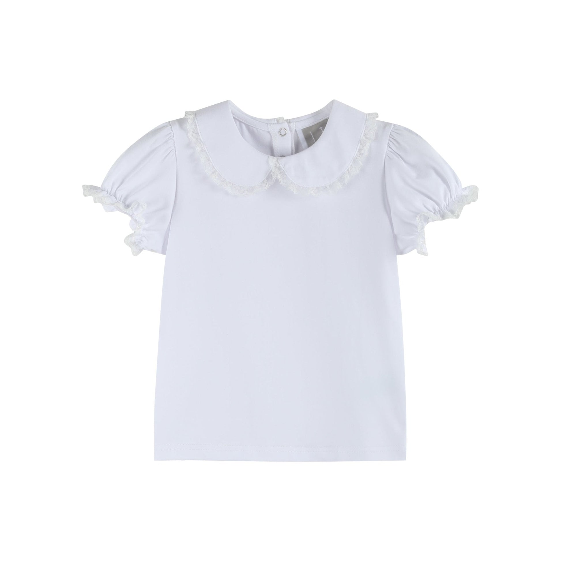 The perfect basic staple for your little sweetie's closet. A beautiful short sleeve top made in the softest cotton. Detailed with a pretty lace trimmed collar and bubble sleeves to make it the perfect option for under rompers, overalls or even on its own. This collared top is also great for embroidery and monograms to make it a one-of-a-kind look.