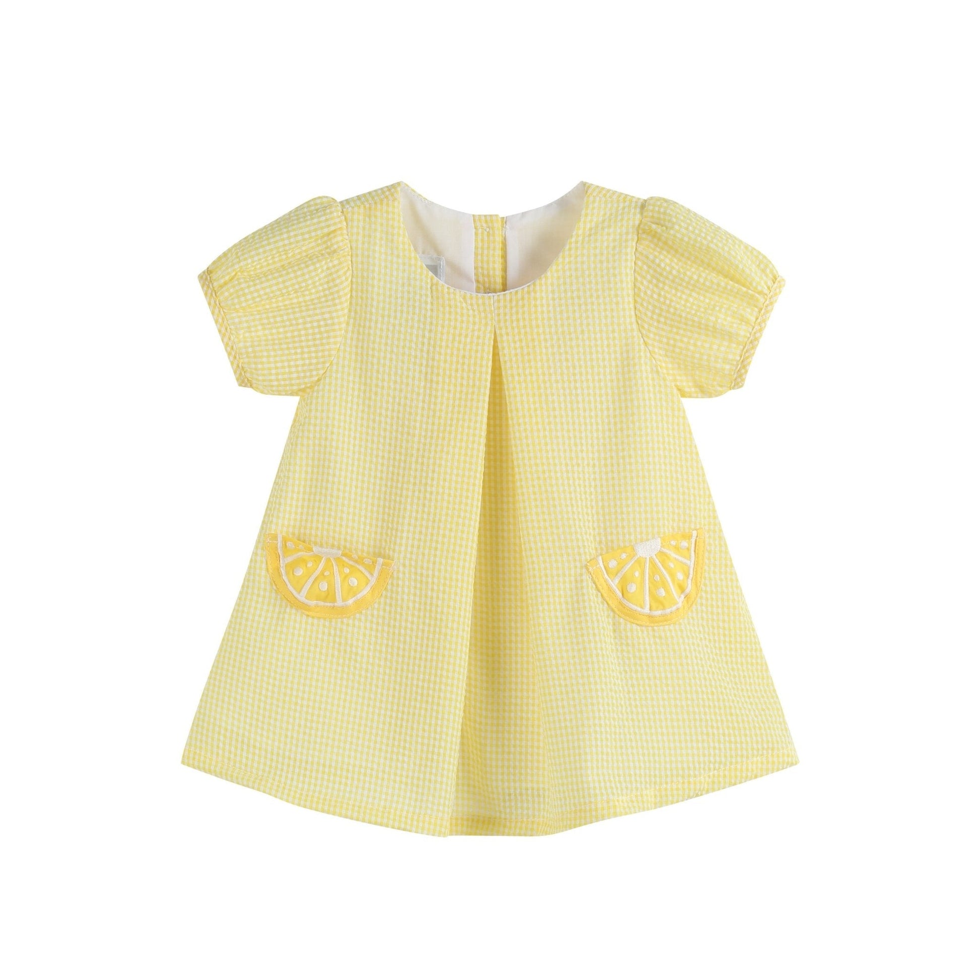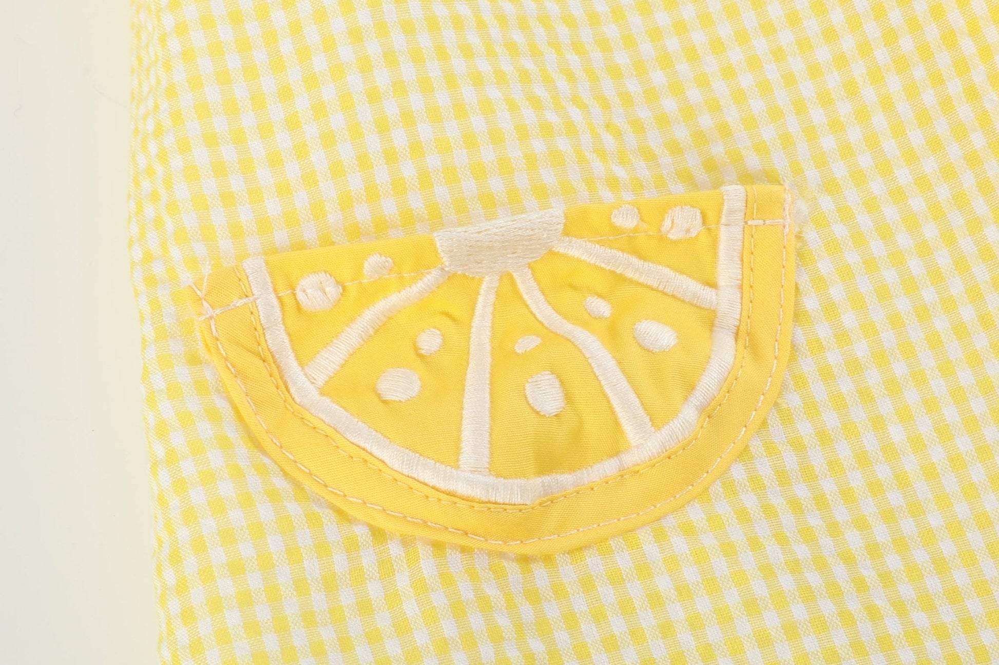Dress your little one in sweet summertime style with our Yellow Lemon Dress and Panty Cover Set. Crafted from 100% soft cotton, it features delightful lemon pockets and cute button back. Perfect for sunny days and endless giggles!