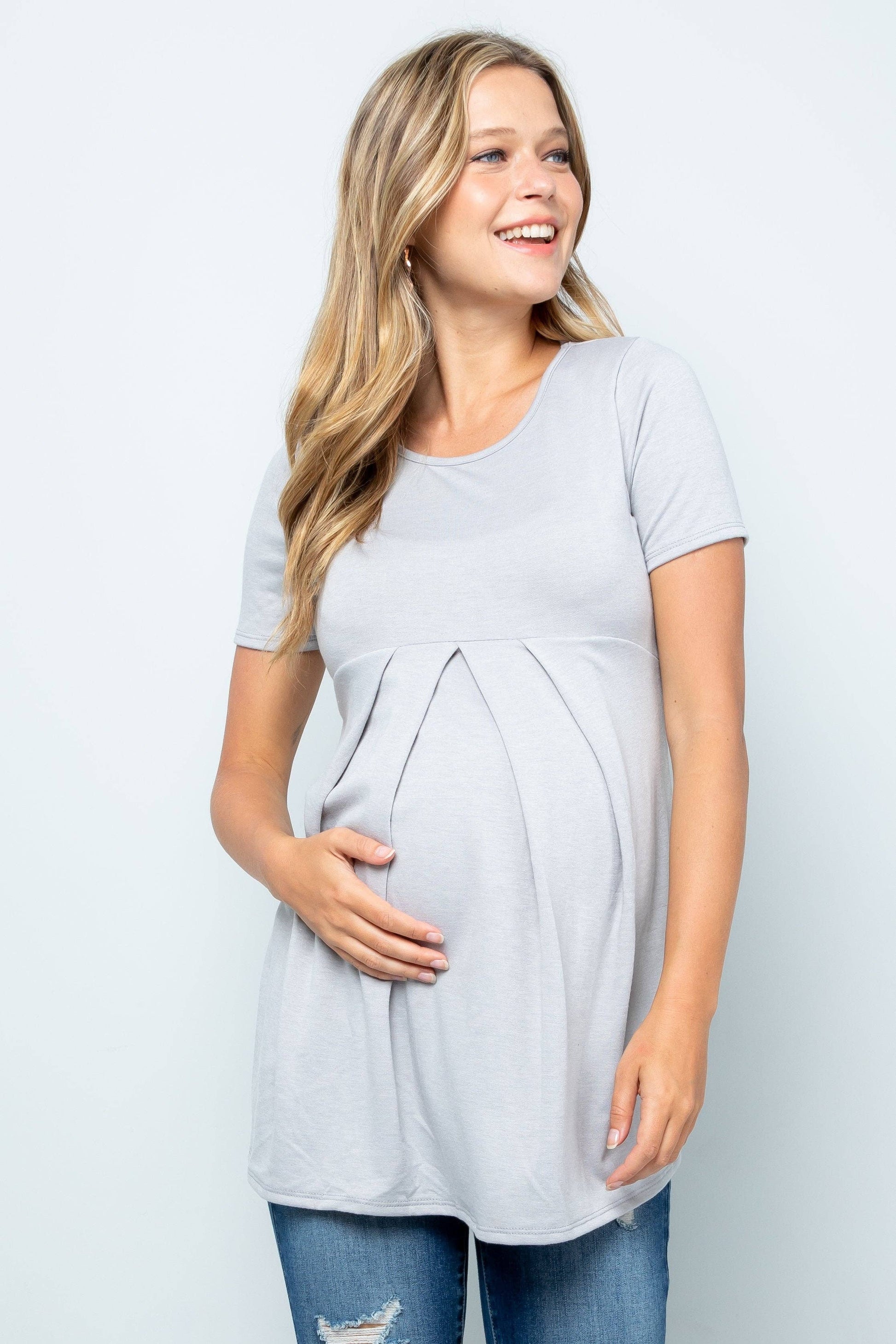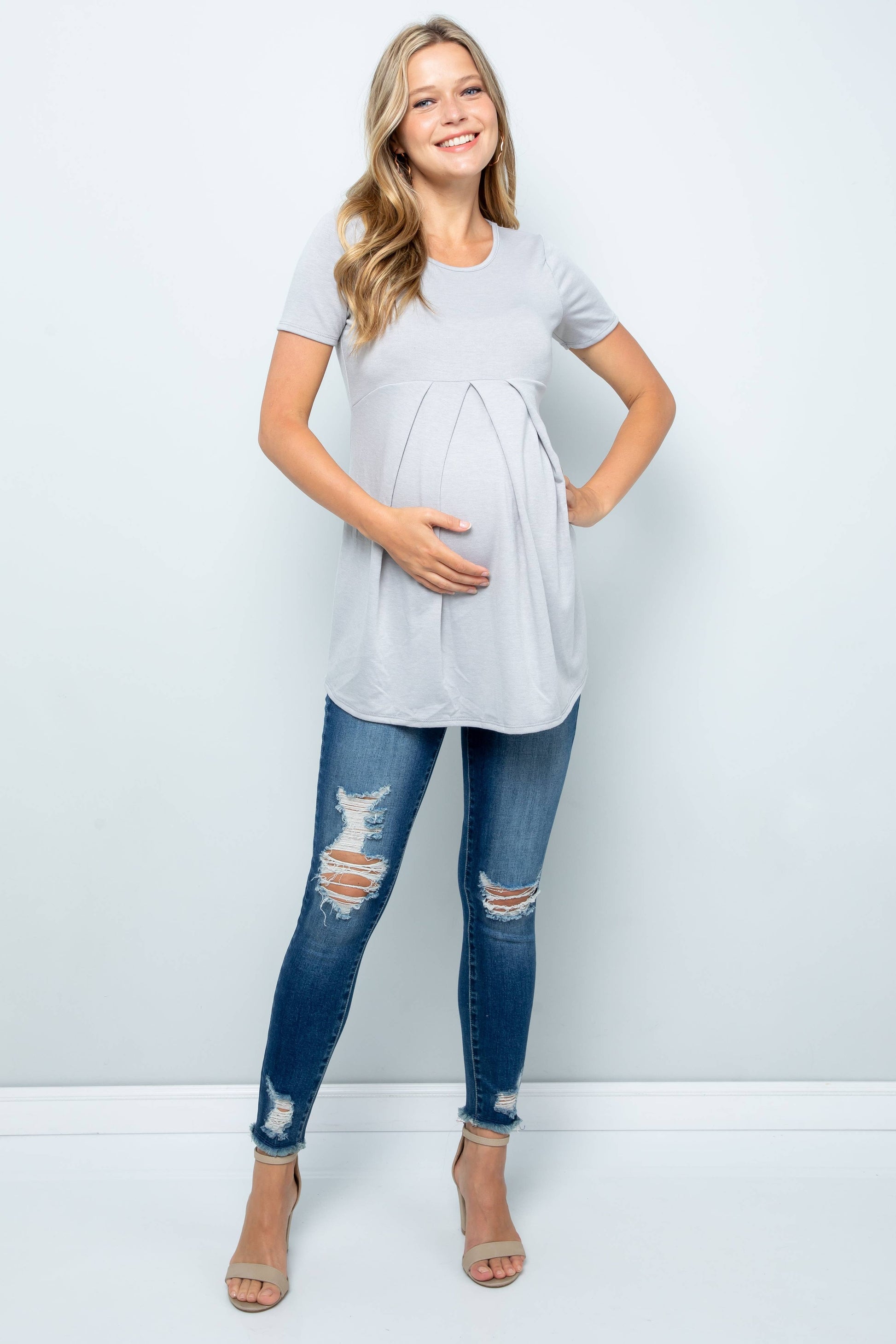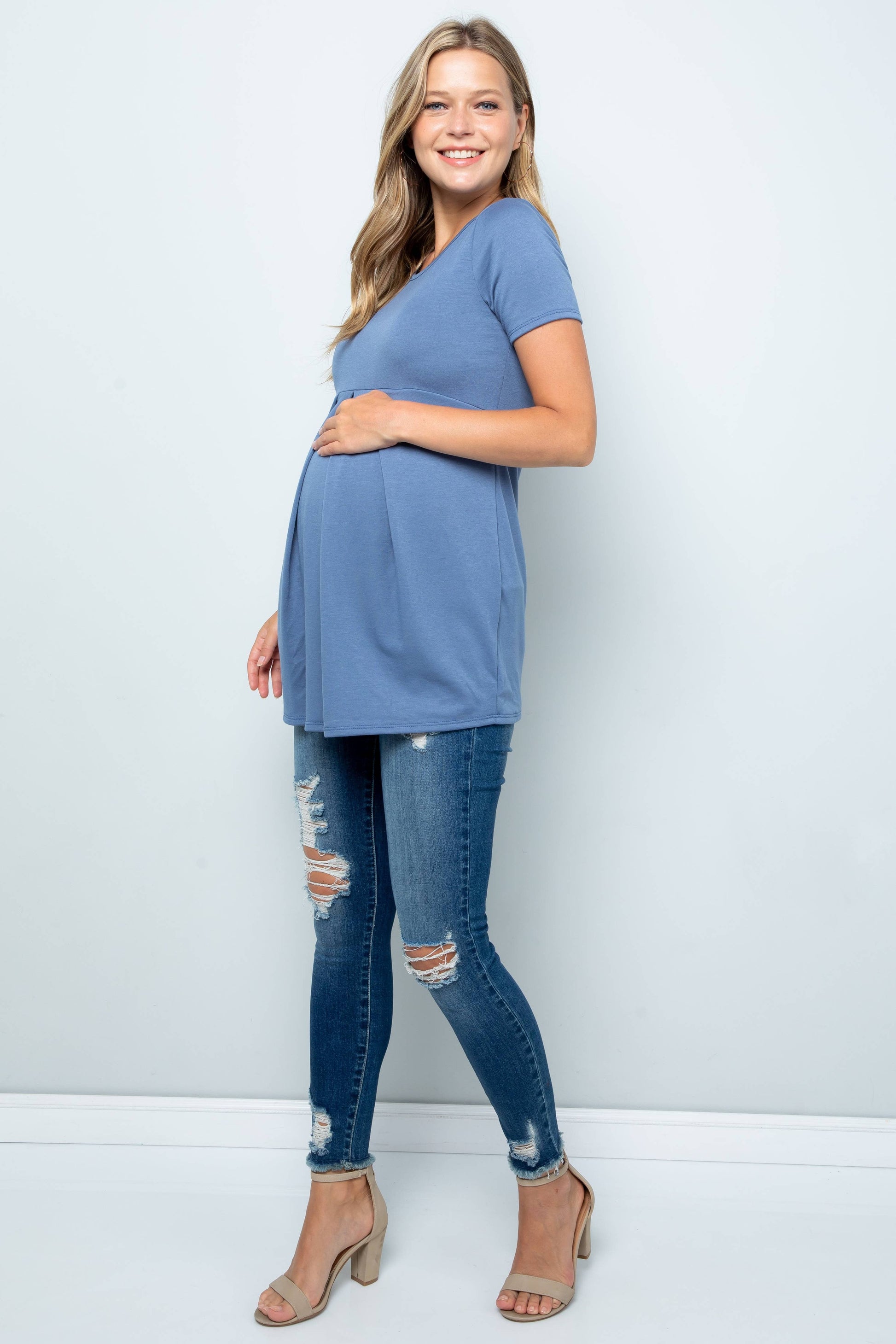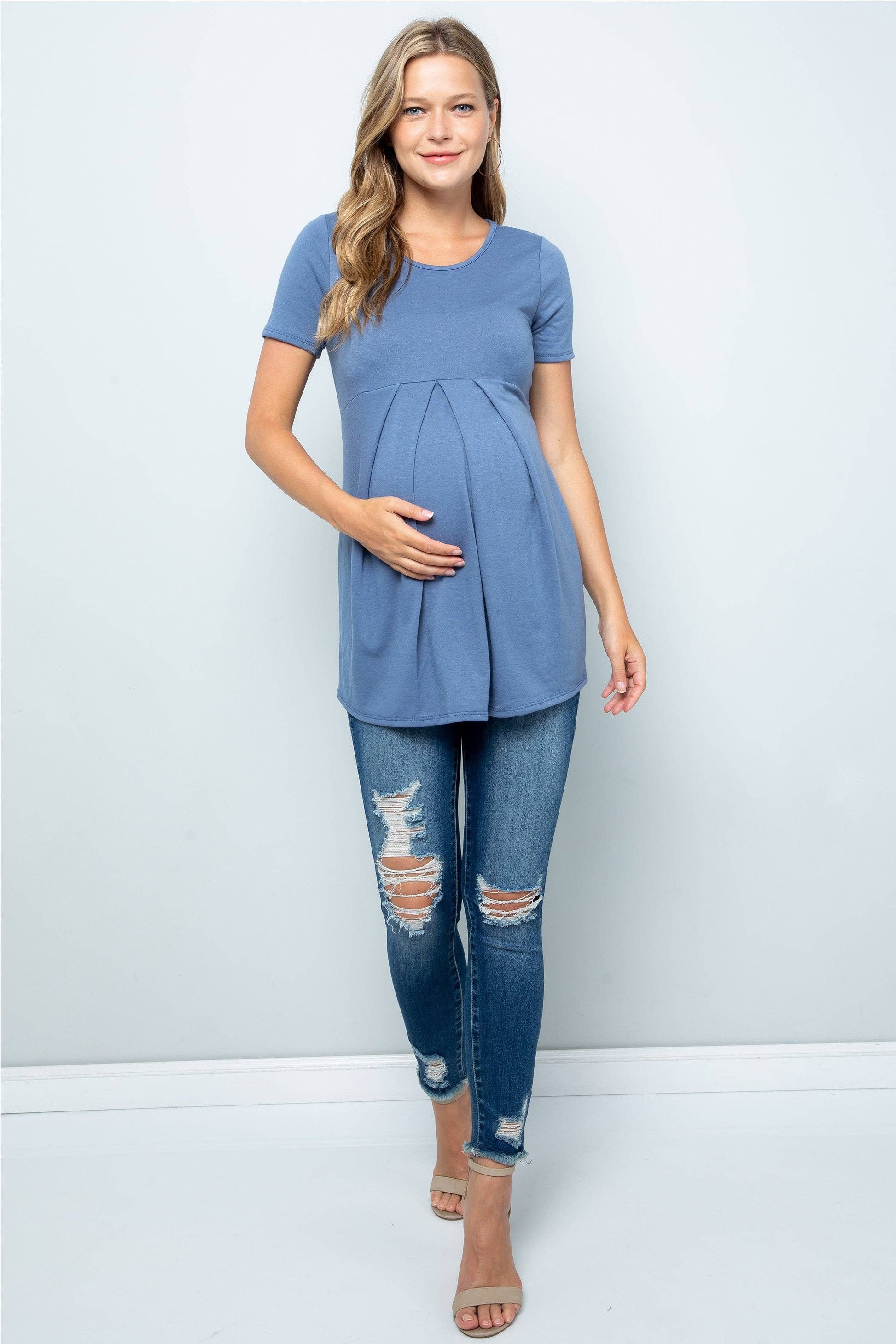 The Zoey short sleeve top is constructed of comfortable french terry that is stretchy, light, and breathable. Comfortable for any pregnant mama to wear all day long for any occasion. Specially designed for a comfortable daily wear. This top is fitted up top but loose enough around your bump making it comfortable to move in. Can be easily dressed up or down. You can wear this top to any occasion such as going to work, running errands, or when dining out.