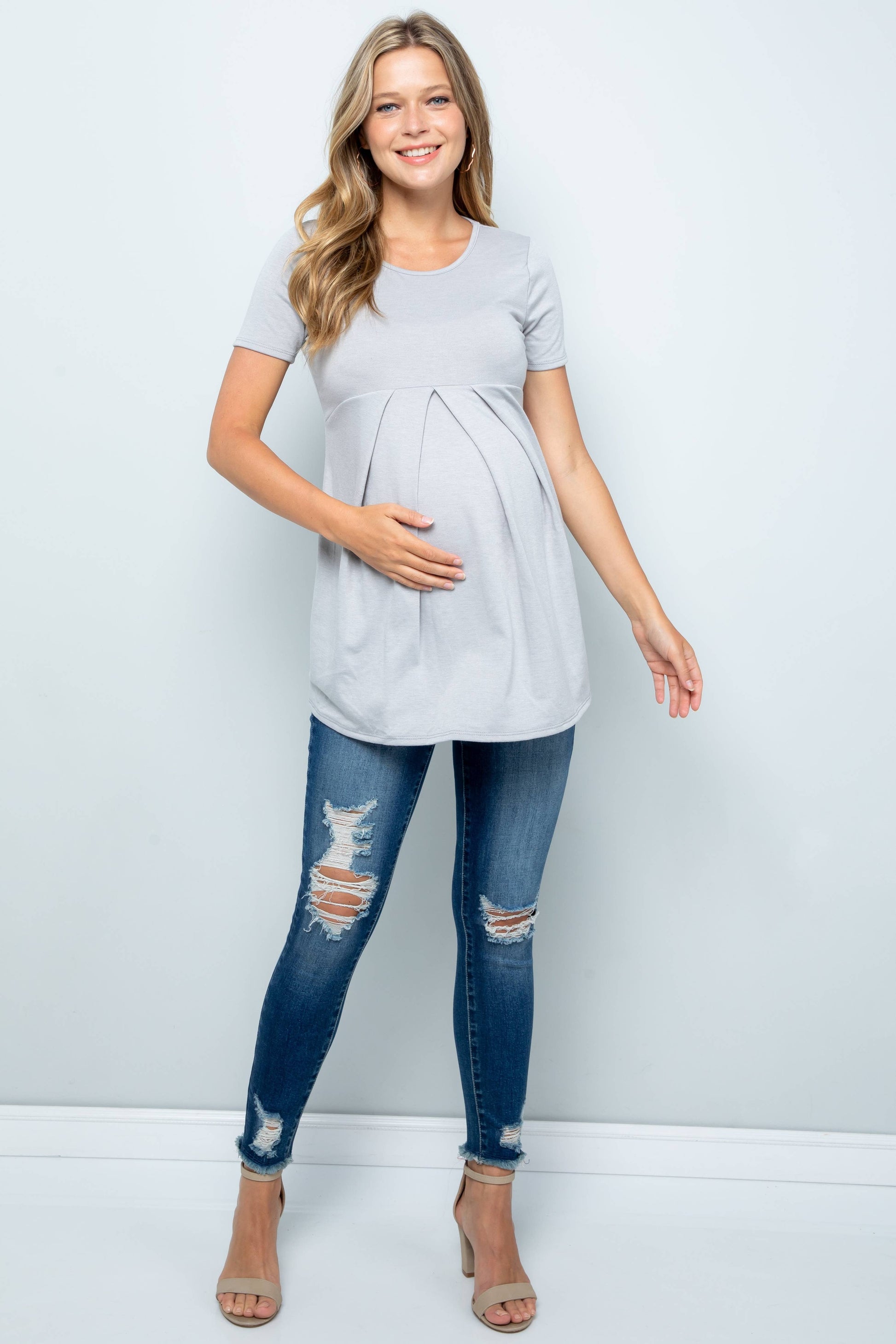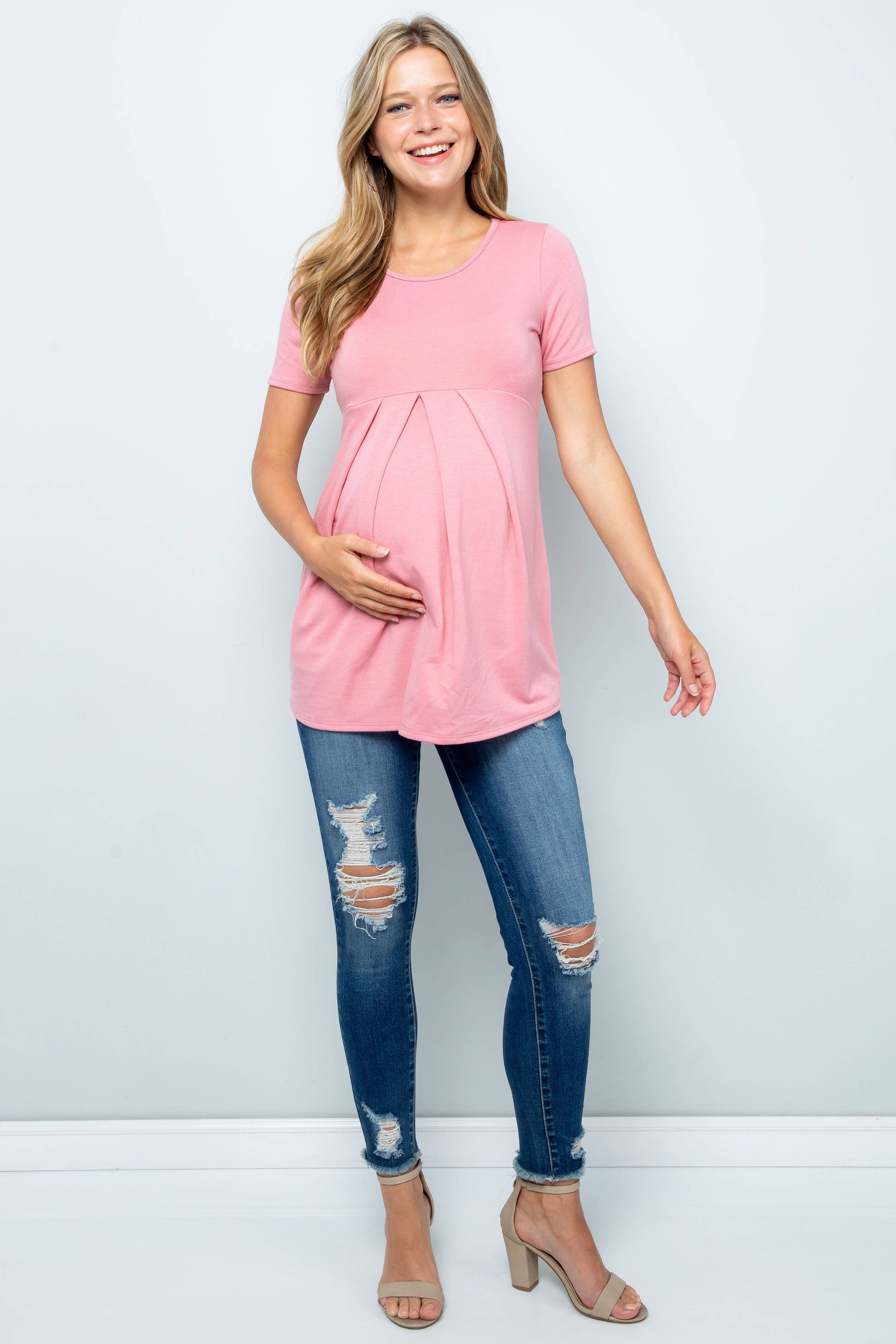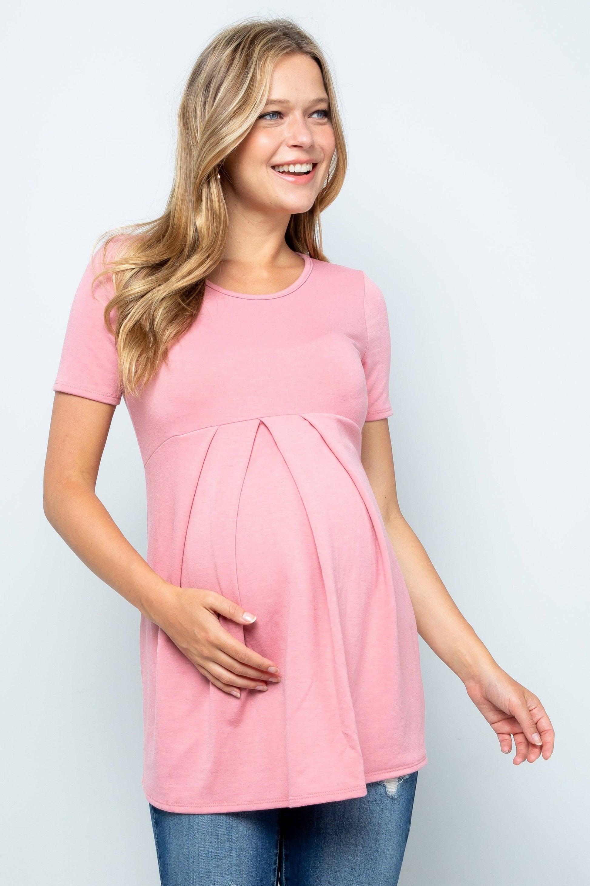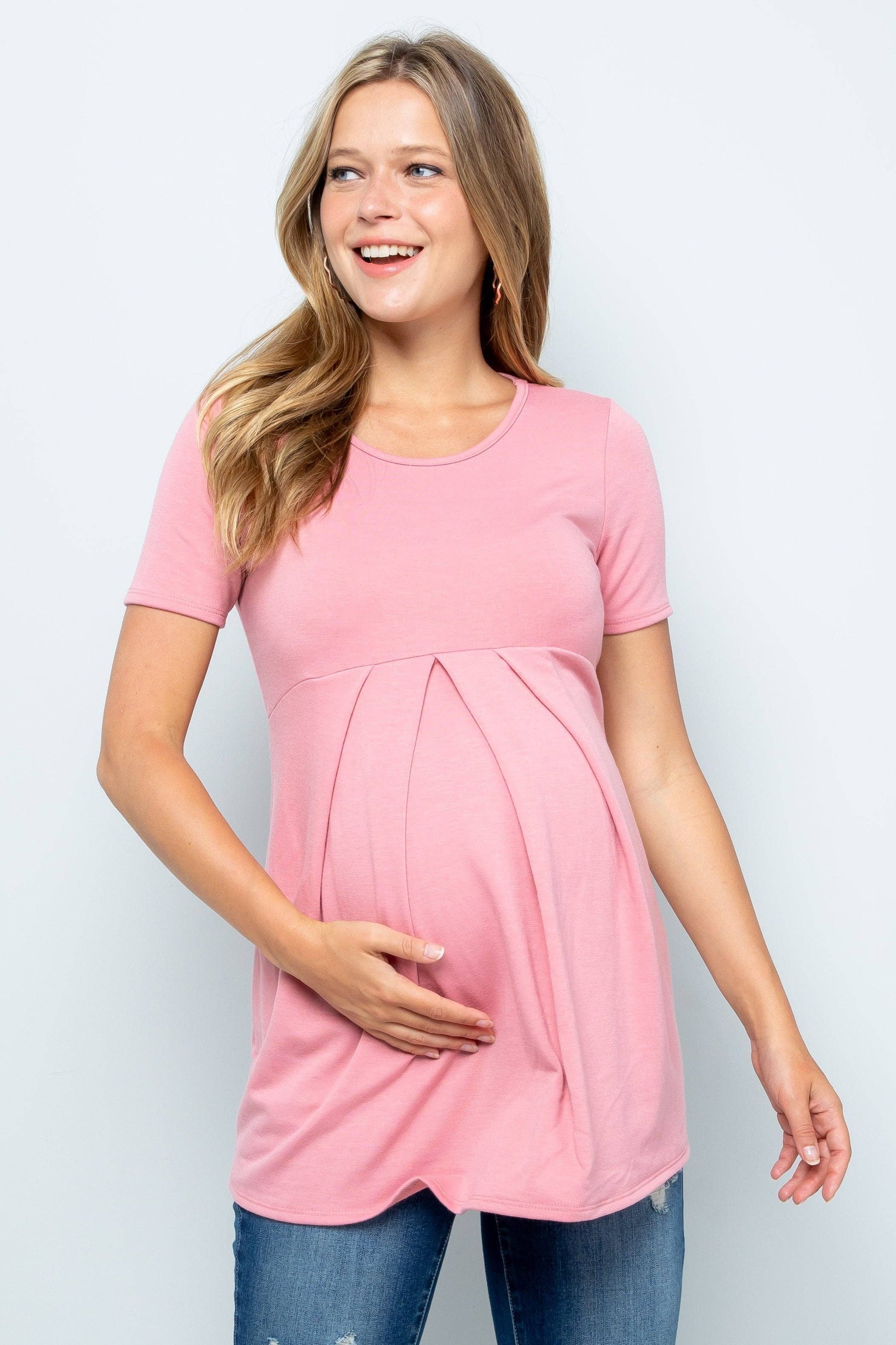 The Zoey short sleeve top is constructed of comfortable french terry that is stretchy, light, and breathable. Comfortable for any pregnant mama to wear all day long for any occasion. Specially designed for a comfortable daily wear. This top is fitted up top but loose enough around your bump making it comfortable to move in. Can be easily dressed up or down. You can wear this top to any occasion such as going to work, running errands, or when dining out.